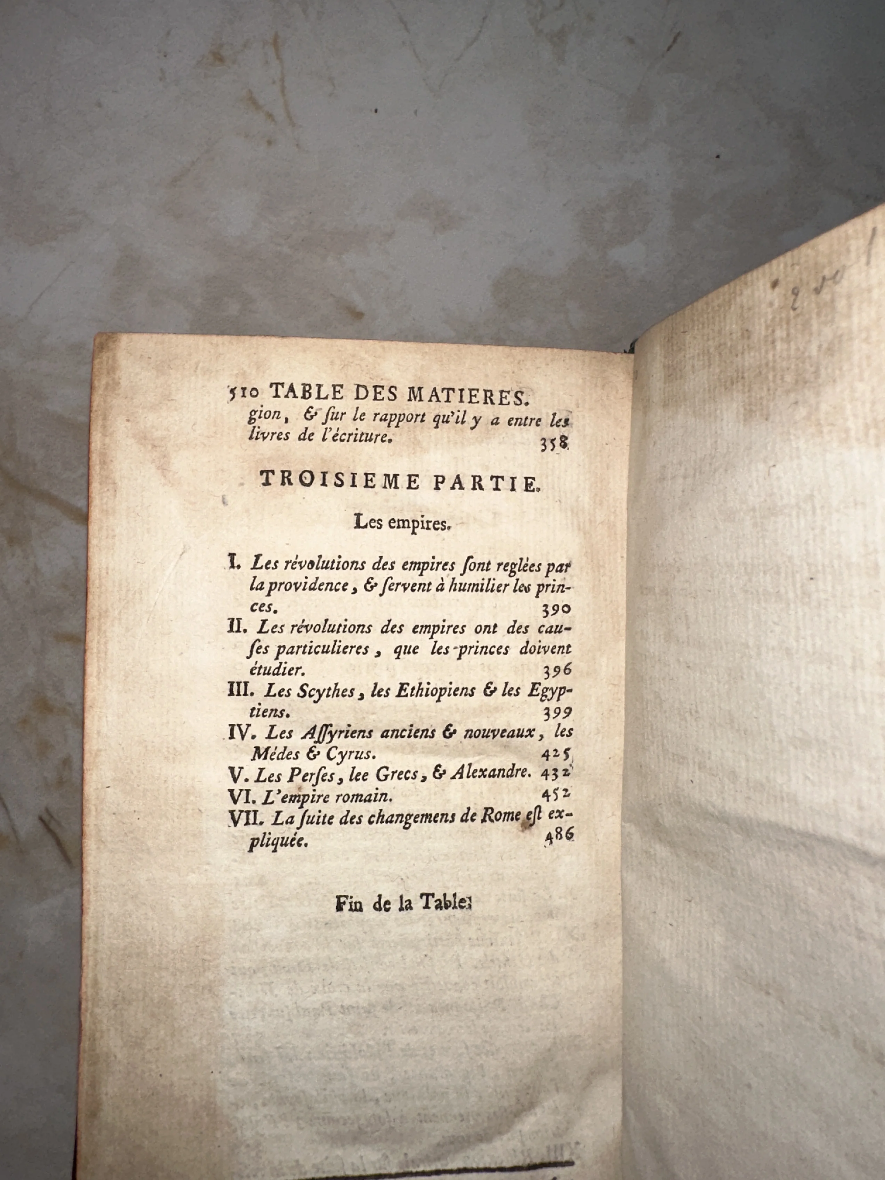Страница старинной книги на французском языке с заголовком Table des Matieres и перечнем глав о древних империях.