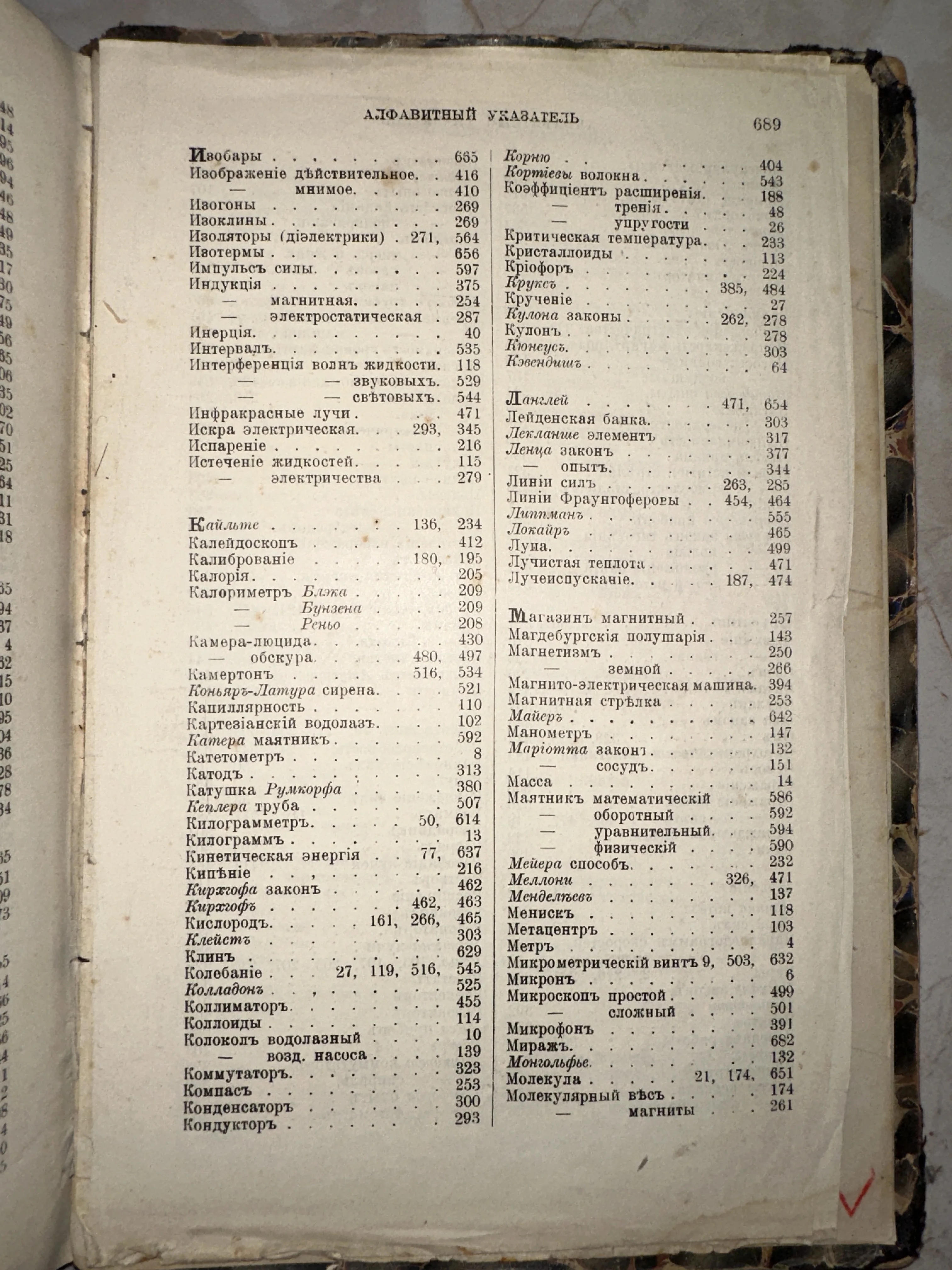 Уникальный фрагмент истории науки: страница с алфавитным указателем физических терминов, напечатанная в классической дореволюционной орфографии. Благородная патина времени на пожелтевшей бумаге и четкие типографские шрифты XIX века создают неповторимую атмосферу академической строгости. Этот предмет станет ценным приобретением для коллекционеров старинных учебных пособий и любителей научной эстетики прошлого.