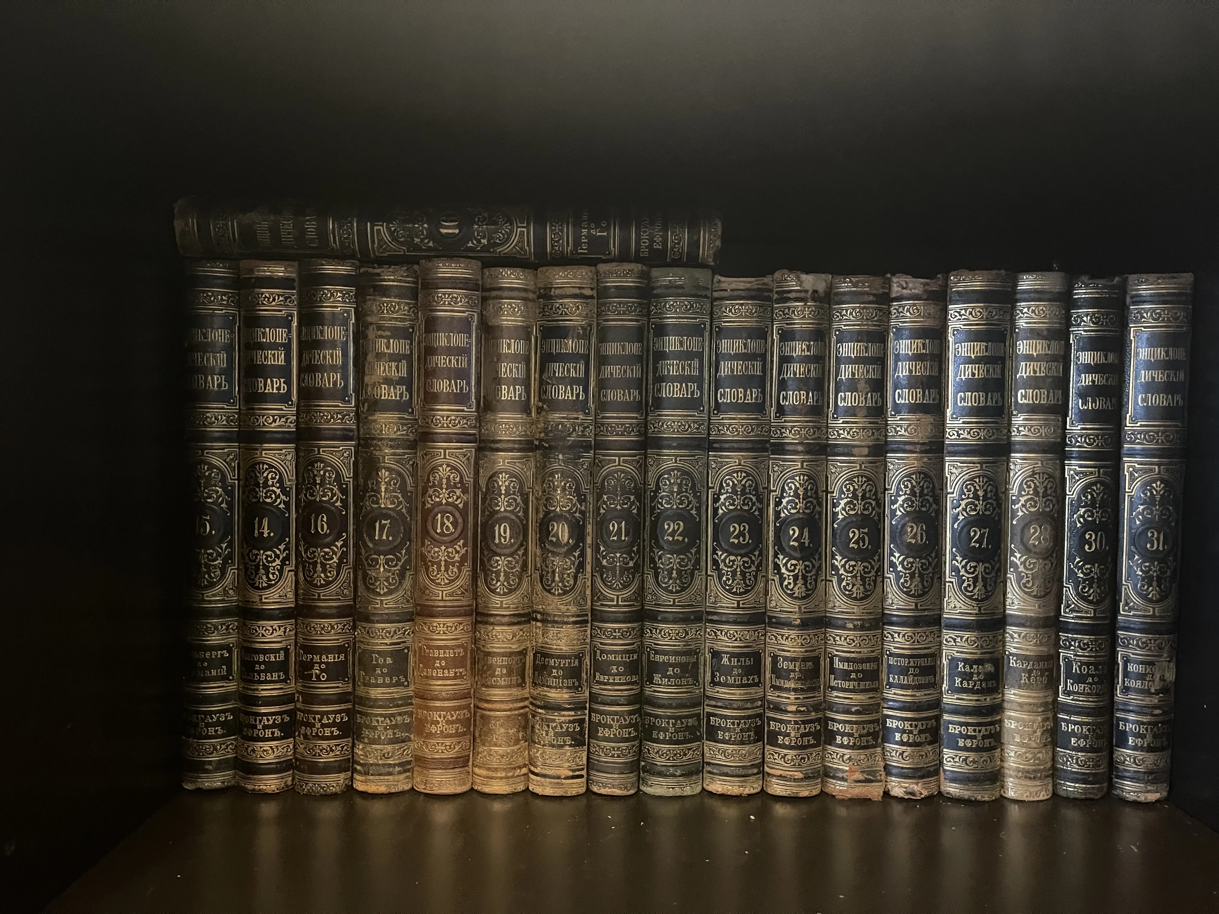 Ряд корешков антикварных книг Энциклопедического словаря Брокгауза и Ефрона с золотым тиснением на темной полке.