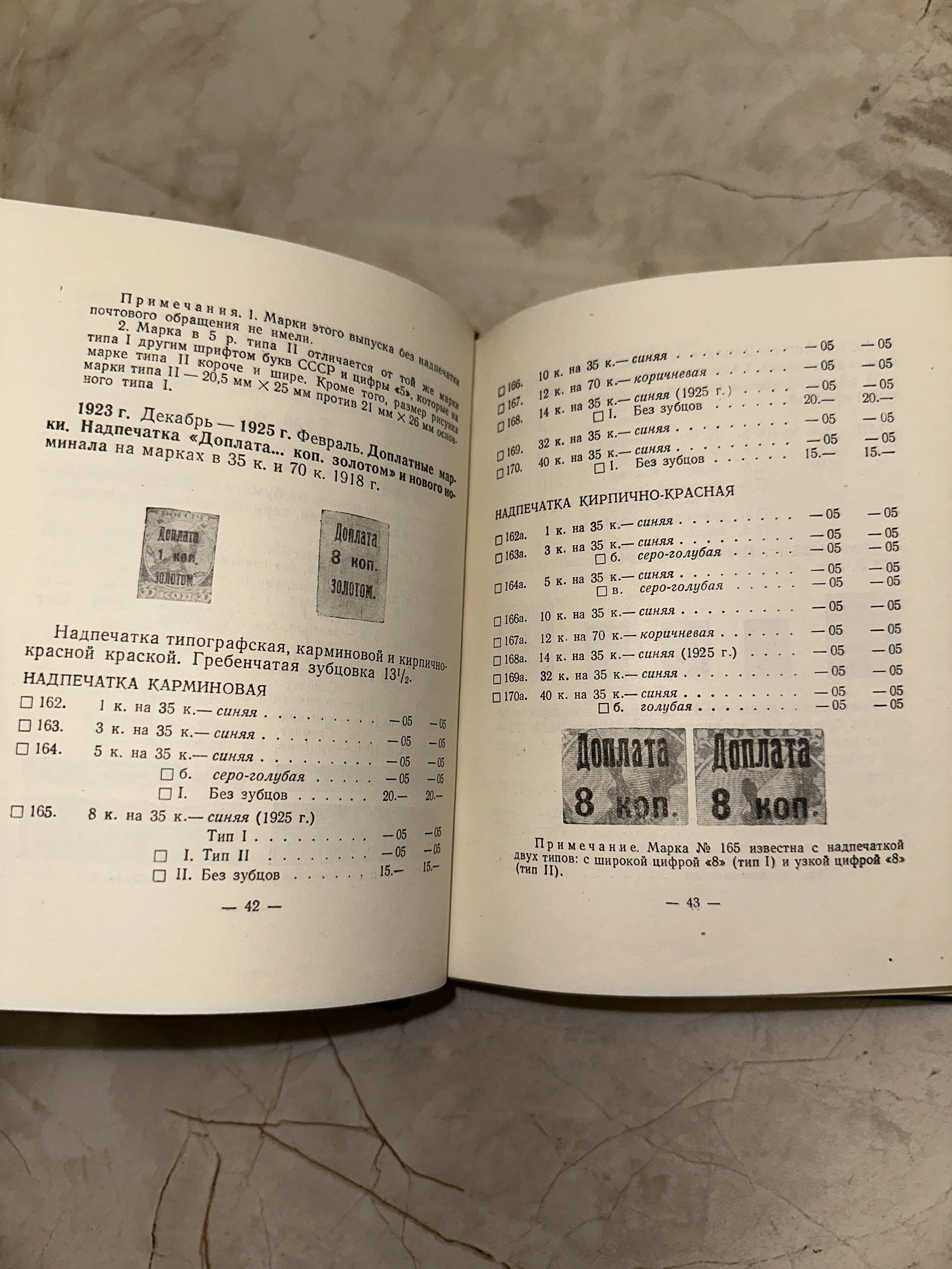 Редкий экземпляр филателистического справочника, детально описывающий выпуски доплатных марок раннего советского периода. Страницы содержат подробные таблицы с разновидностями надпечаток и ценными указаниями для коллекционеров, сохранив аутентичную типографику эпохи.