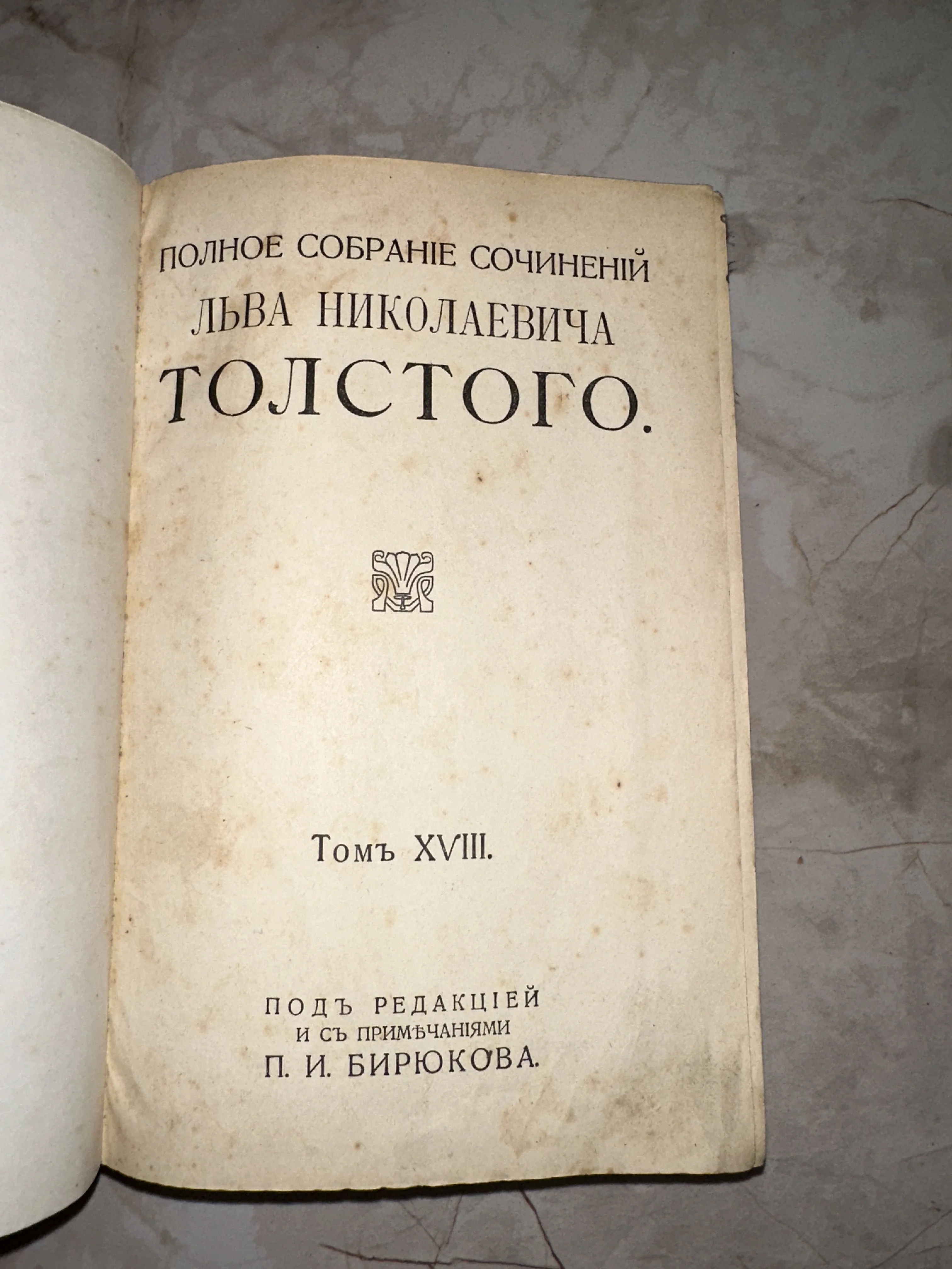 Титульный лист антикварной книги Льва Николаевича Толстого, том 18, под редакцией П. И. Бирюкова.