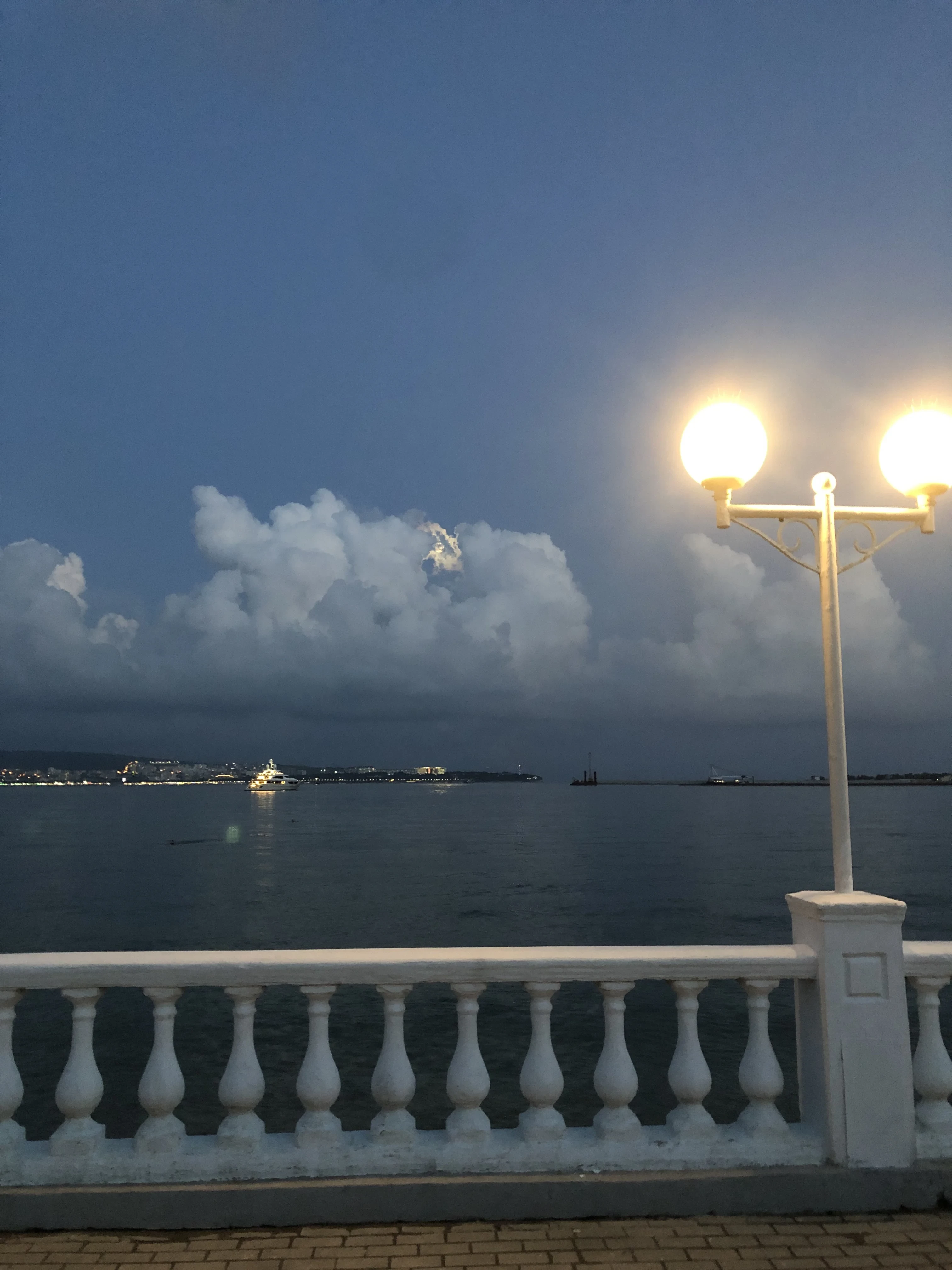 Классический вид на ночную бухту, наполненный ностальгией по безмятежному отдыху. Изящная белая балюстрада и мягкий свет фонаря создают уютную раму для морского пейзажа с огнями далекого судна под драматичными облаками.