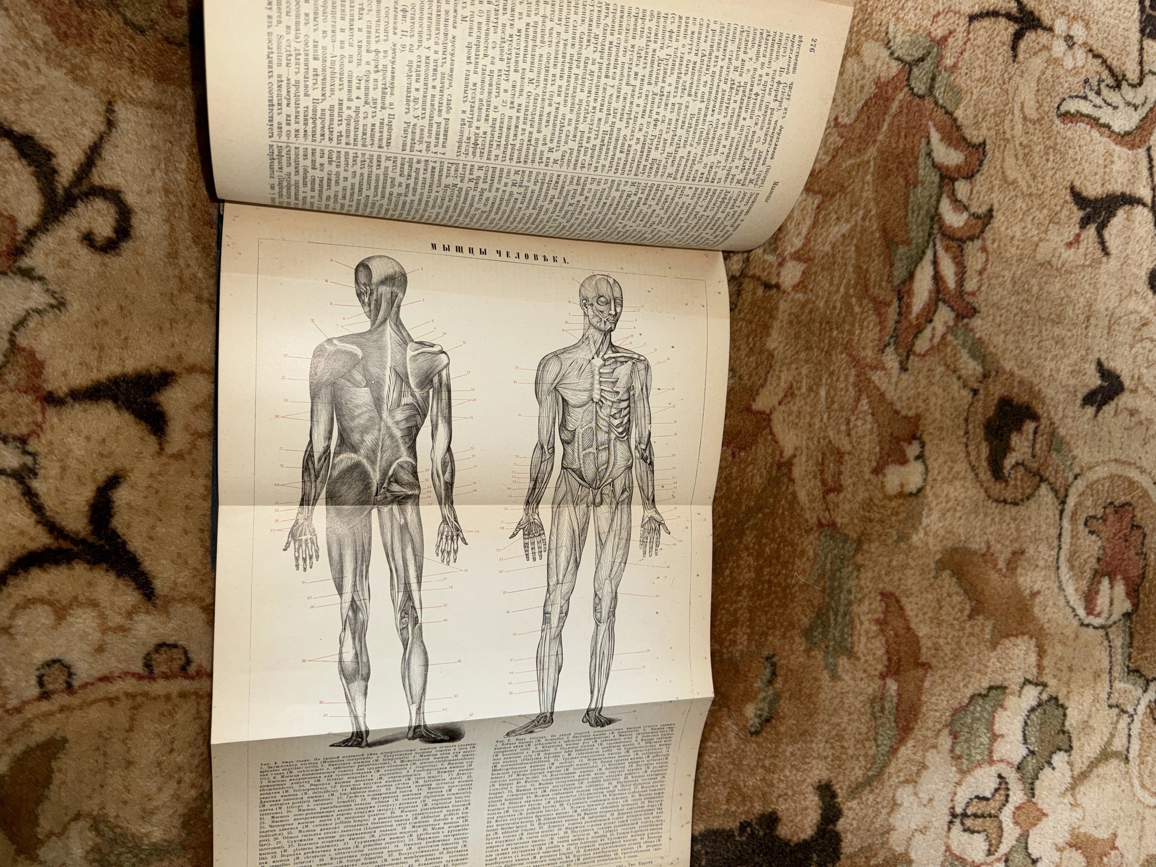 Перед вами редкий образец старинной медицинской графики, детально демонстрирующий сложное строение человеческого тела. Тонкая прорисовка мышечных волокон и классическая дореволюционная типографика передают дух эпохи больших научных открытий. Желтоватая патина бумаги и складки разворота подчеркивают подлинность и антикварный шарм этого коллекционного экземпляра.