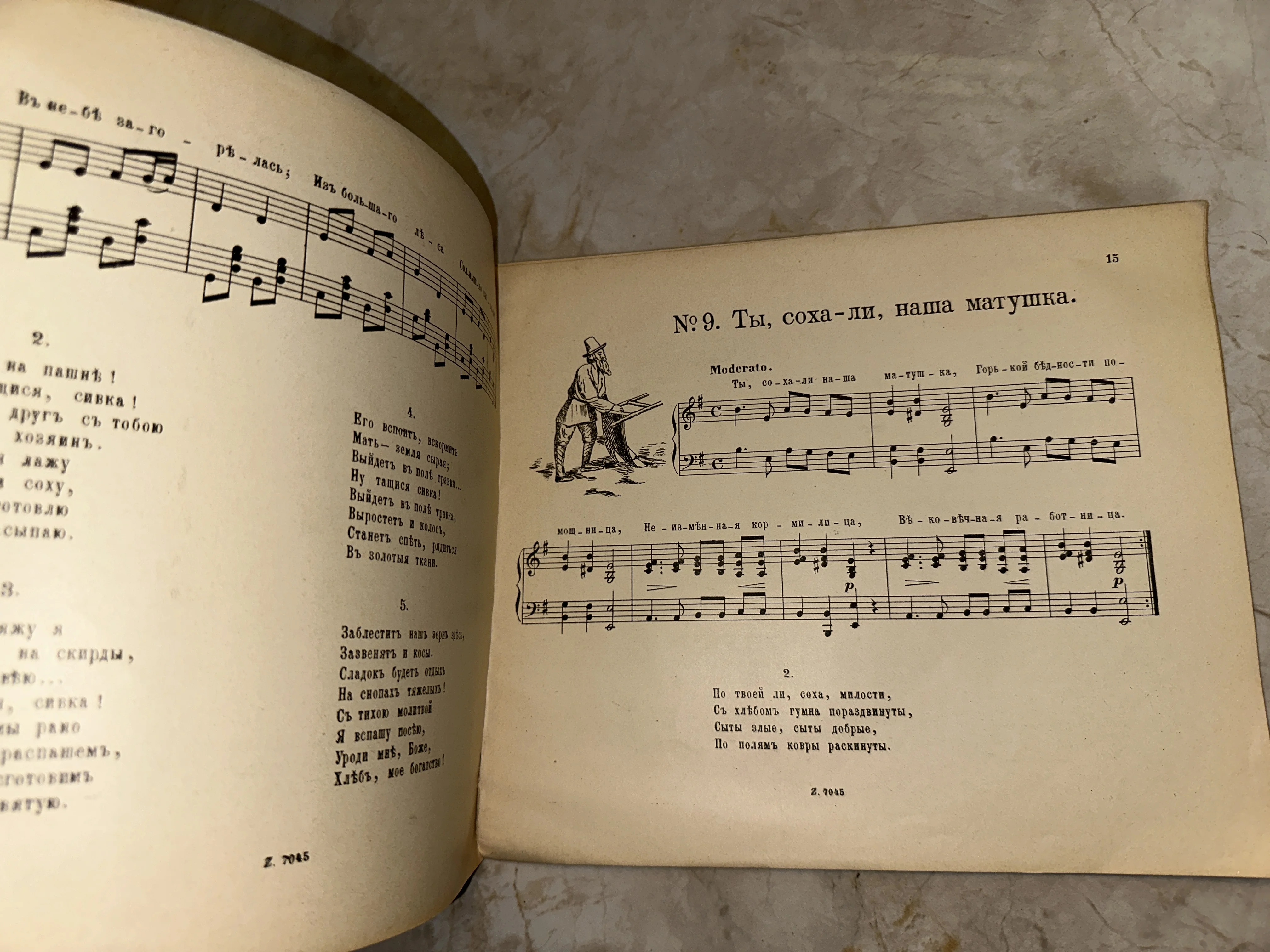 Разворот старинной книги с нотами и текстом песни «Ты, соха-ли, наша матушка» на дореволюционном русском языке с иллюстрацией крестьянина.