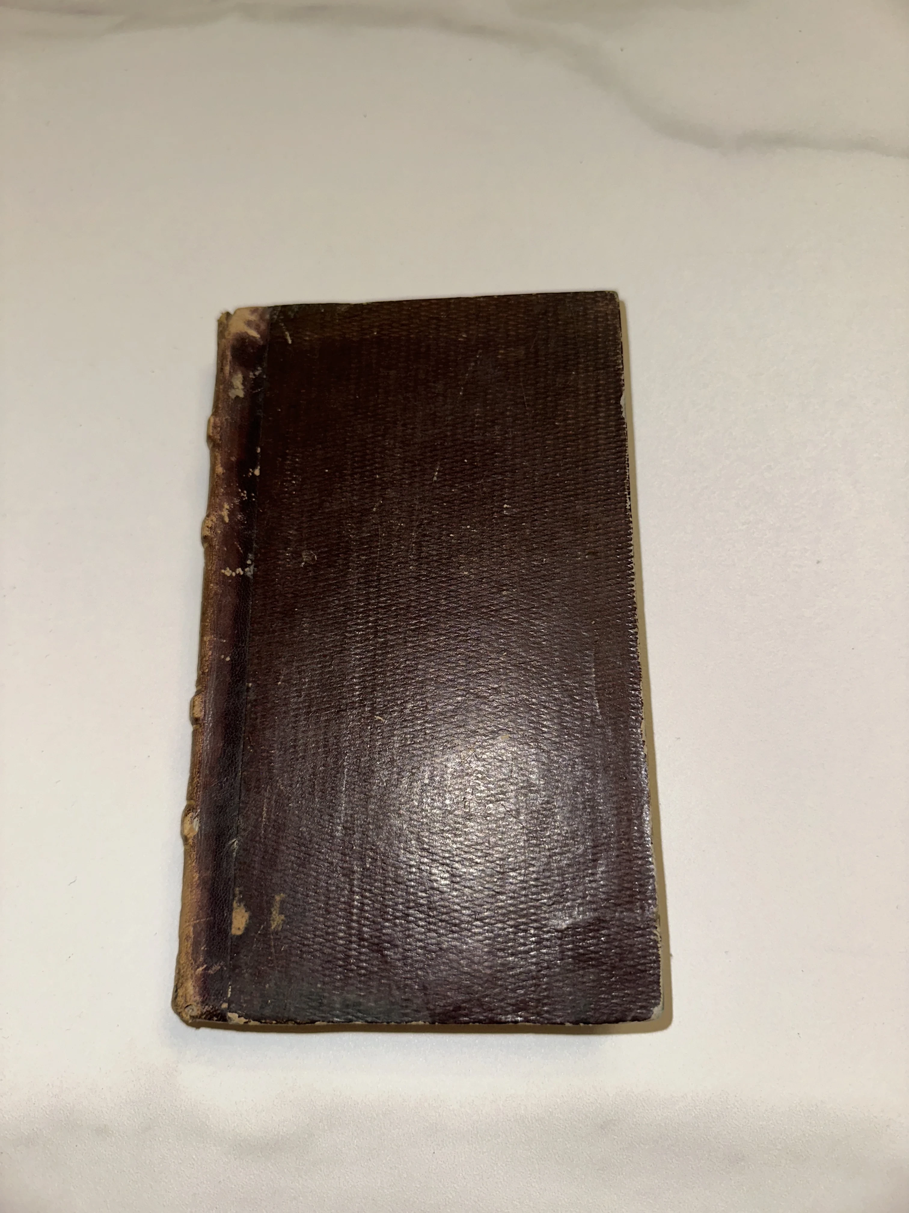 Обложка антикварной книги из темно-коричневой кожи с потертым корешком на белом фоне.