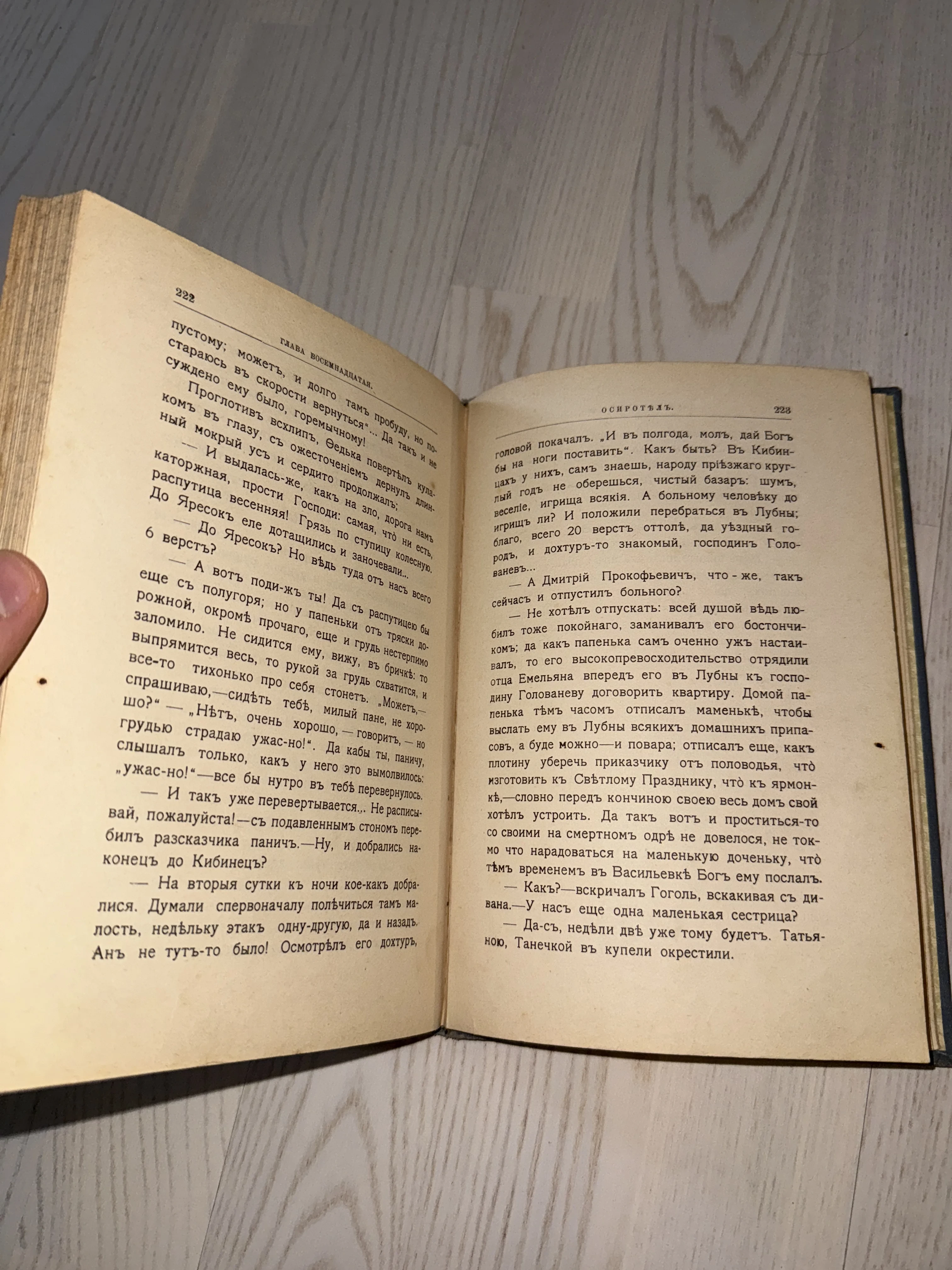 Уникальный образец дореволюционной печати с сохранившейся атмосферой XIX века, о чем свидетельствуют характерные «яти» и пожелтевшие от времени страницы. Текст на развороте содержит упоминание великого писателя Гоголя, что делает этот экземпляр ценной находкой для библиофилов и историков литературы. Книга отличается благородной патиной времени и станет достойным дополнением любой частной коллекции.