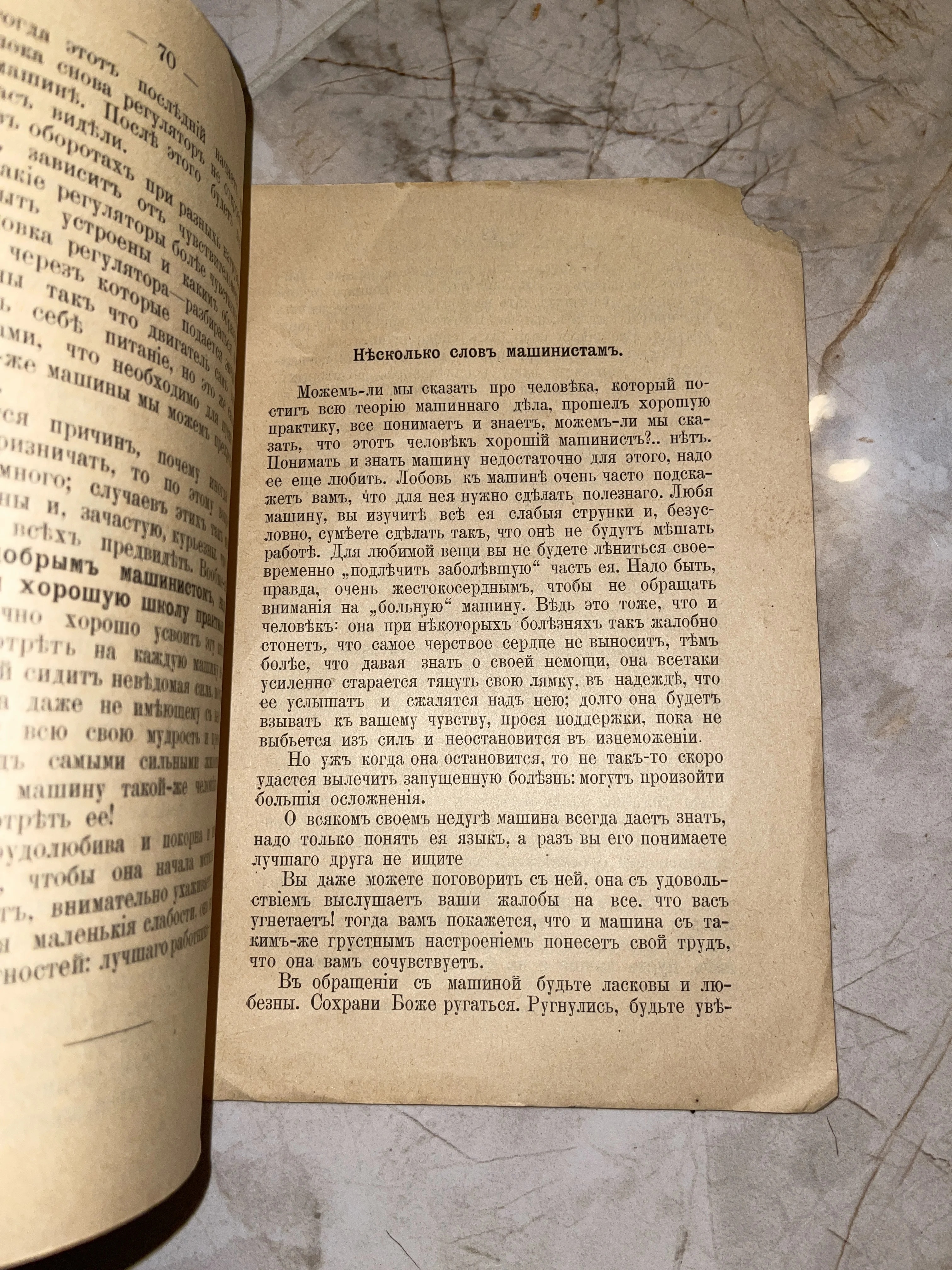 Уникальный фрагмент технического издания, в котором автор призывает рабочих относиться к механизмам с душой и любовью. Пожелтевшая от времени бумага с характерным шрифтом и дореформенной орфографией передает подлинную атмосферу индустриальной эпохи. Прекрасный образец редкой букинистики, подчеркивающий этику и философию труда прошлого века.