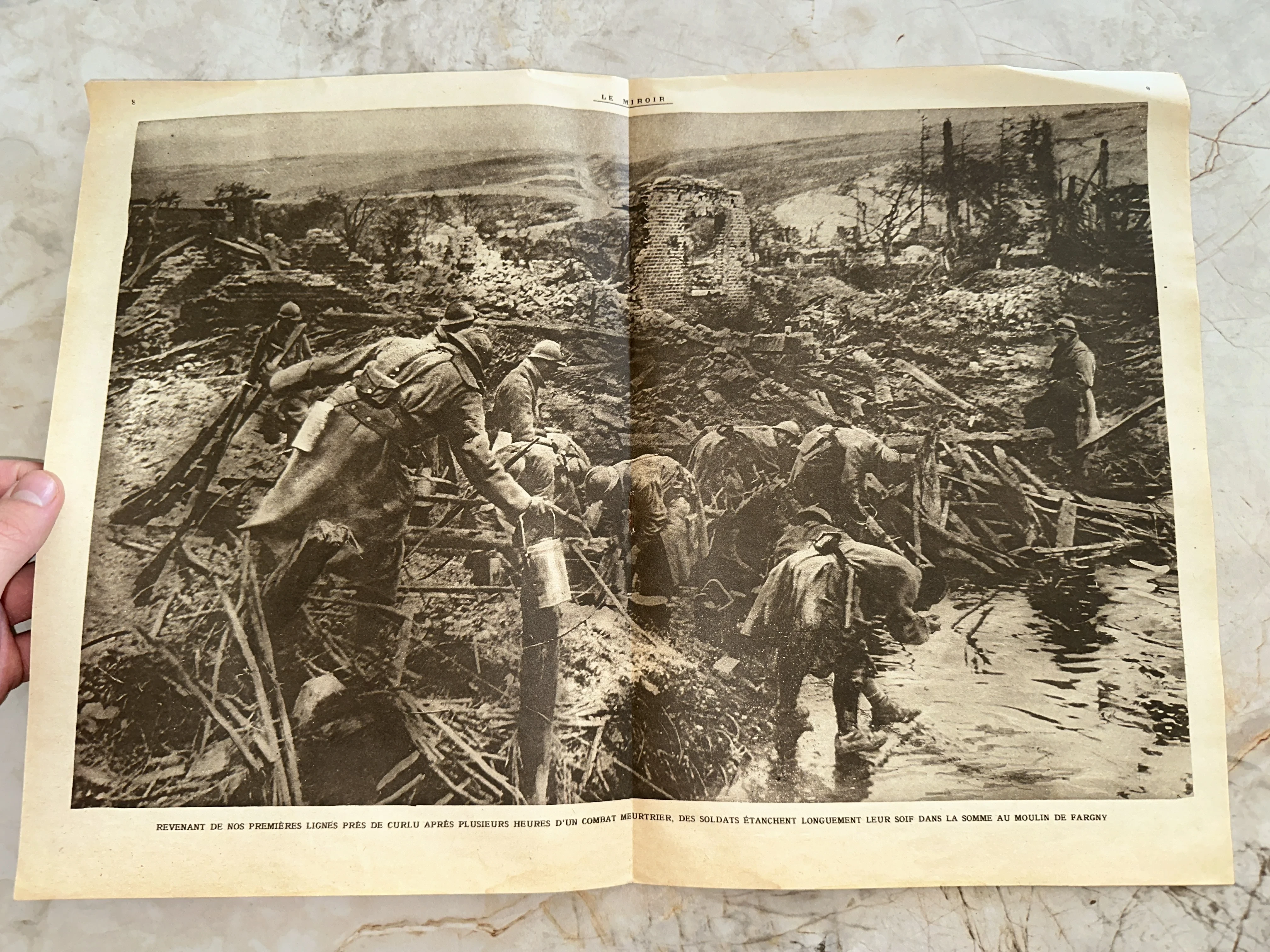Уникальный фрагмент истории, запечатленный на страницах французского издания Le Miroir. Фотография передает драматическую атмосферу битвы на Сомме: уставшие солдаты утоляют жажду на фоне опустошенного ландшафта и руин мельницы Фарньи. Подлинный артефакт с четкой печатью и характерной патиной времени станет ценным дополнением коллекции военной документалистики.