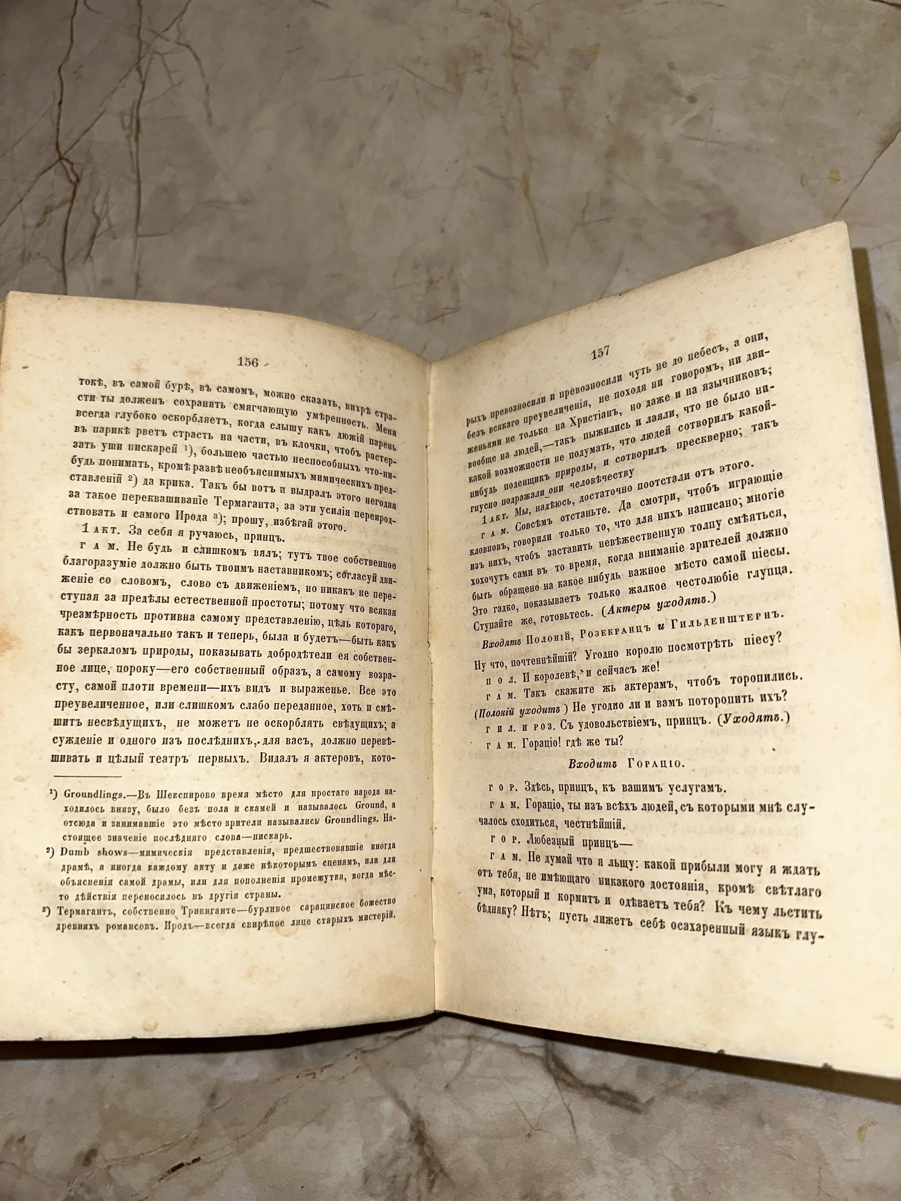 Перед вами редкий разворот старинной книги, сохранивший дух театральной классики прошлых столетий. Текст на дореволюционной кириллице с характерными «ятями» передает подлинную атмосферу антикварного издания. Пожелтевшие от времени страницы и аутентичный шрифт делают этот экземпляр ценной находкой для истинного библиофила.