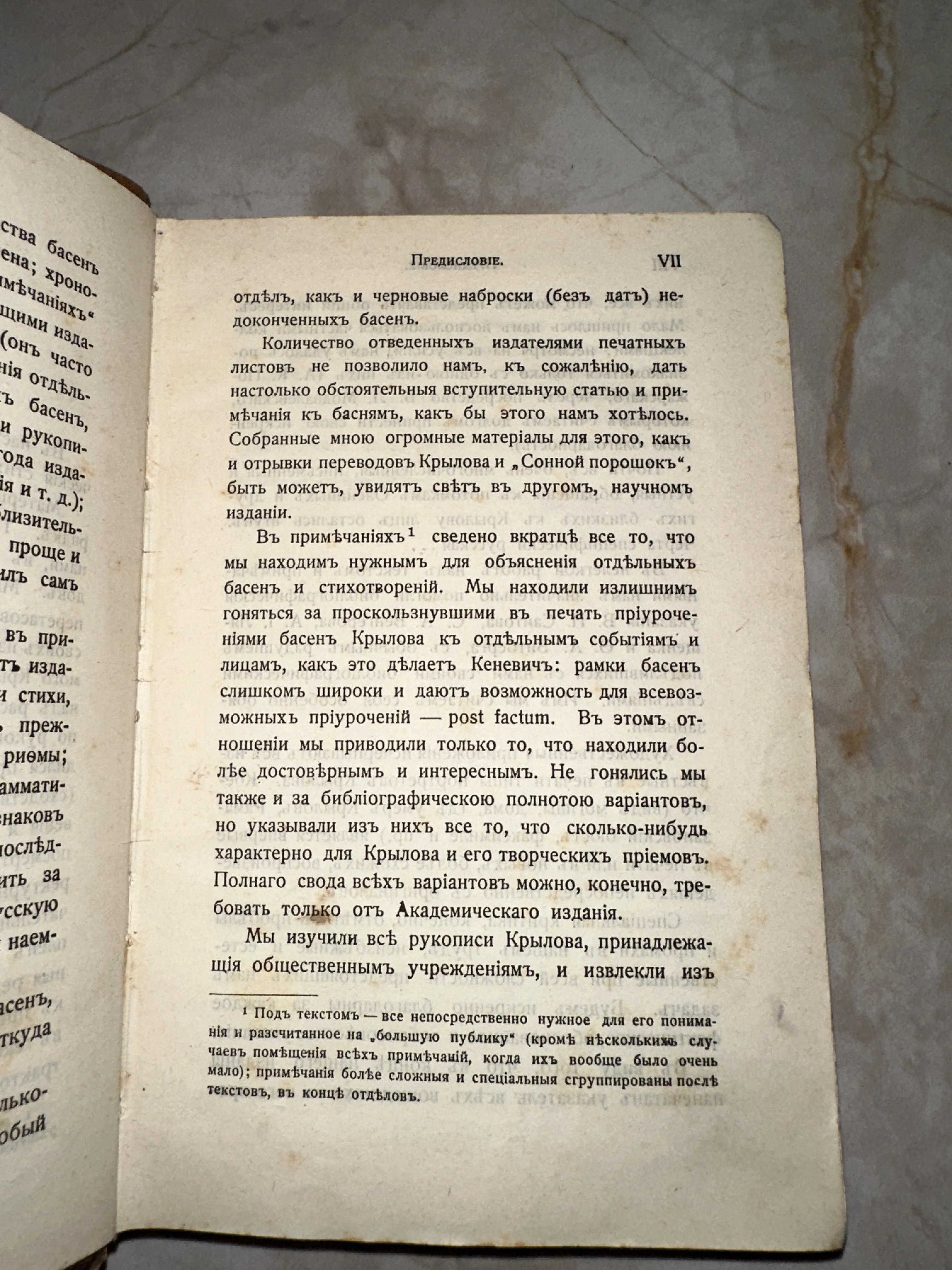 Перед вами подлинный фрагмент истории русской литературы — страница предисловия к академическому разбору басен Ивана Крылова. Пожелтевшая от времени бумага с благородной патиной и четкий дореволюционный шрифт создают атмосферу кабинетной тишины начала прошлого века. Издание представляет коллекционный интерес благодаря детальному анализу рукописей и творческих приемов великого баснописца.
