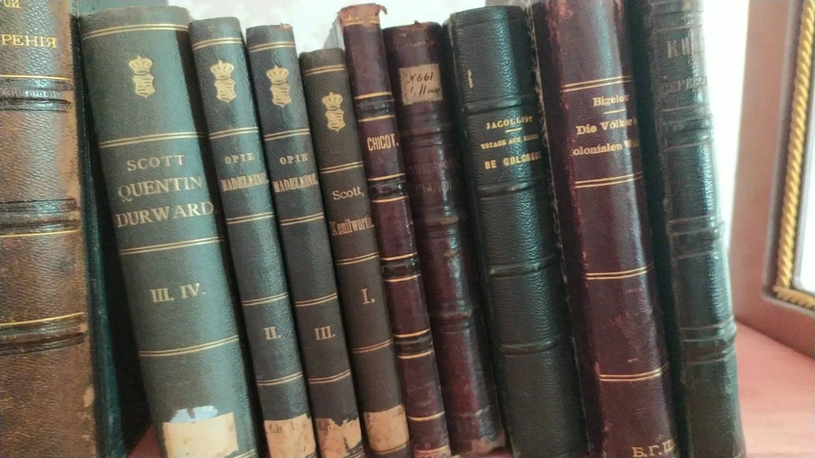 Ряд старинных книг с тиснением на корешках, среди которых произведения Вальтера Скотта и Амелии Опи.