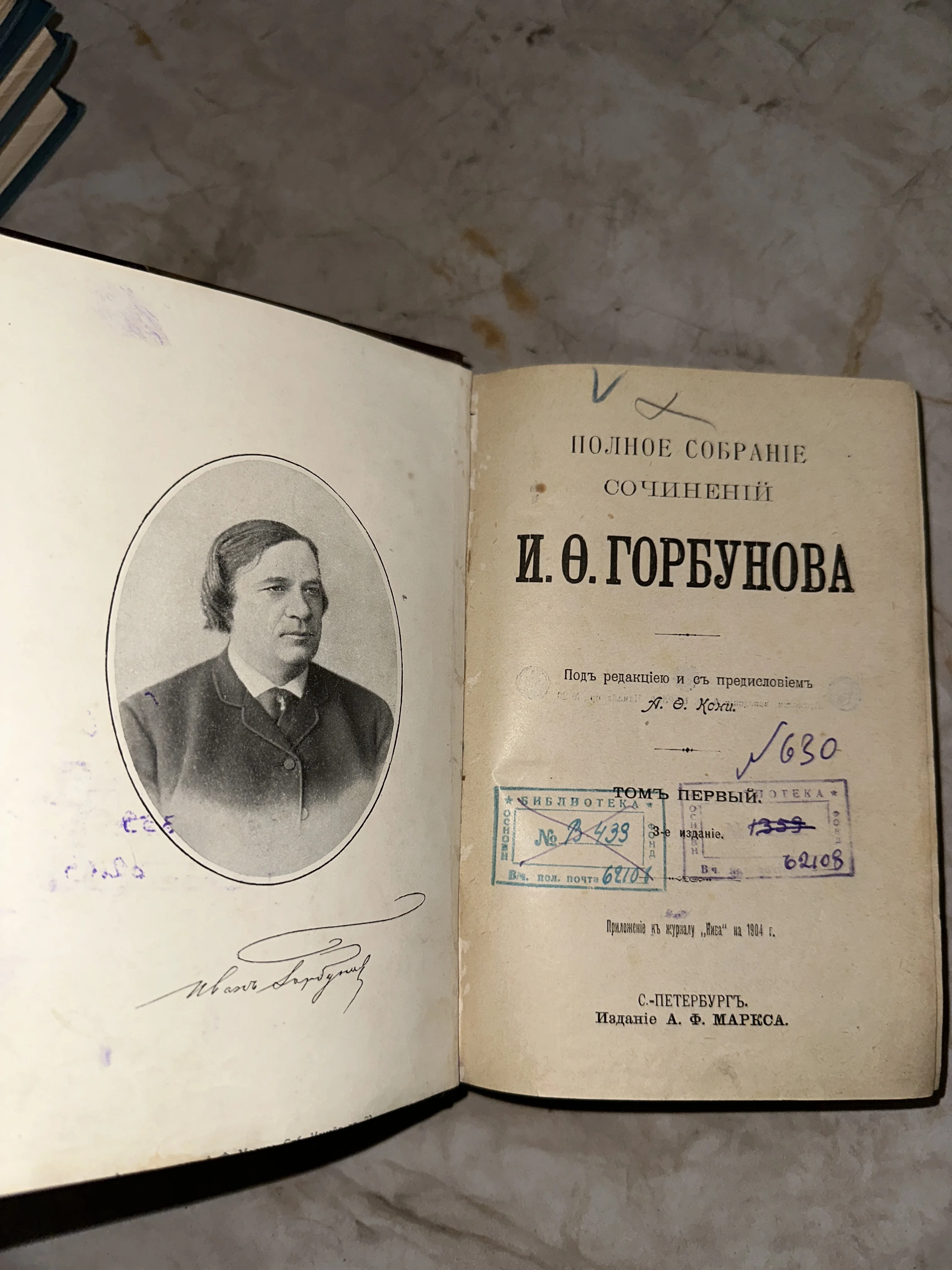 Изящное антикварное издание начала XX века, представляющее собой первый том собрания сочинений знаменитого мастера слова Ивана Горбунова. Книга сохранила дух эпохи благодаря оригинальному фронтиспису с портретом автора и аутентичным библиотечным штампам, свидетельствующим о её долгой истории. Это редкий экземпляр, выпущенный в качестве приложения к журналу «Нива», который станет украшением любой частной библиотеки.