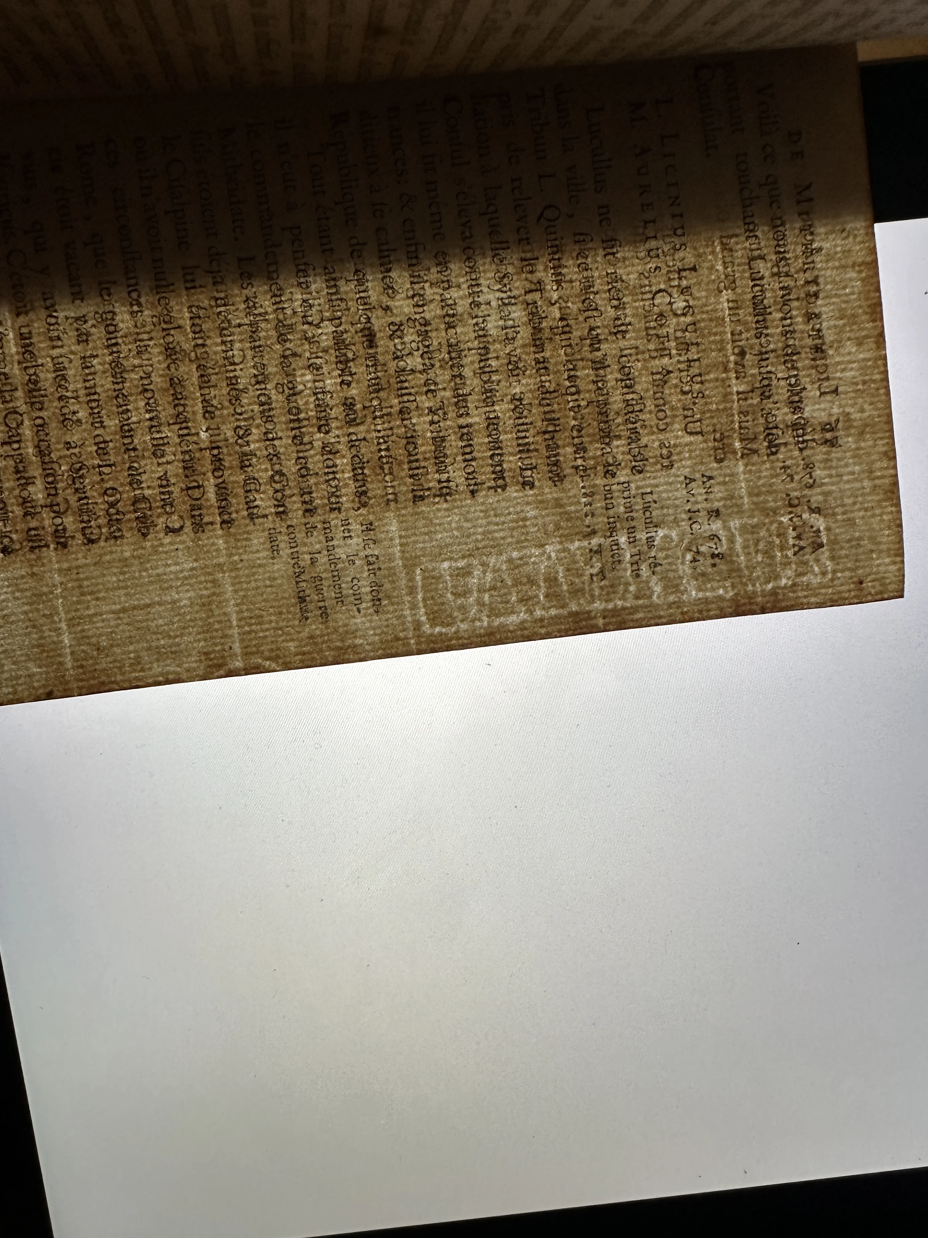 Старинная книжная страница на французском языке с текстом о Лукулле и Котте, пожелтевшая бумага с водяным знаком.