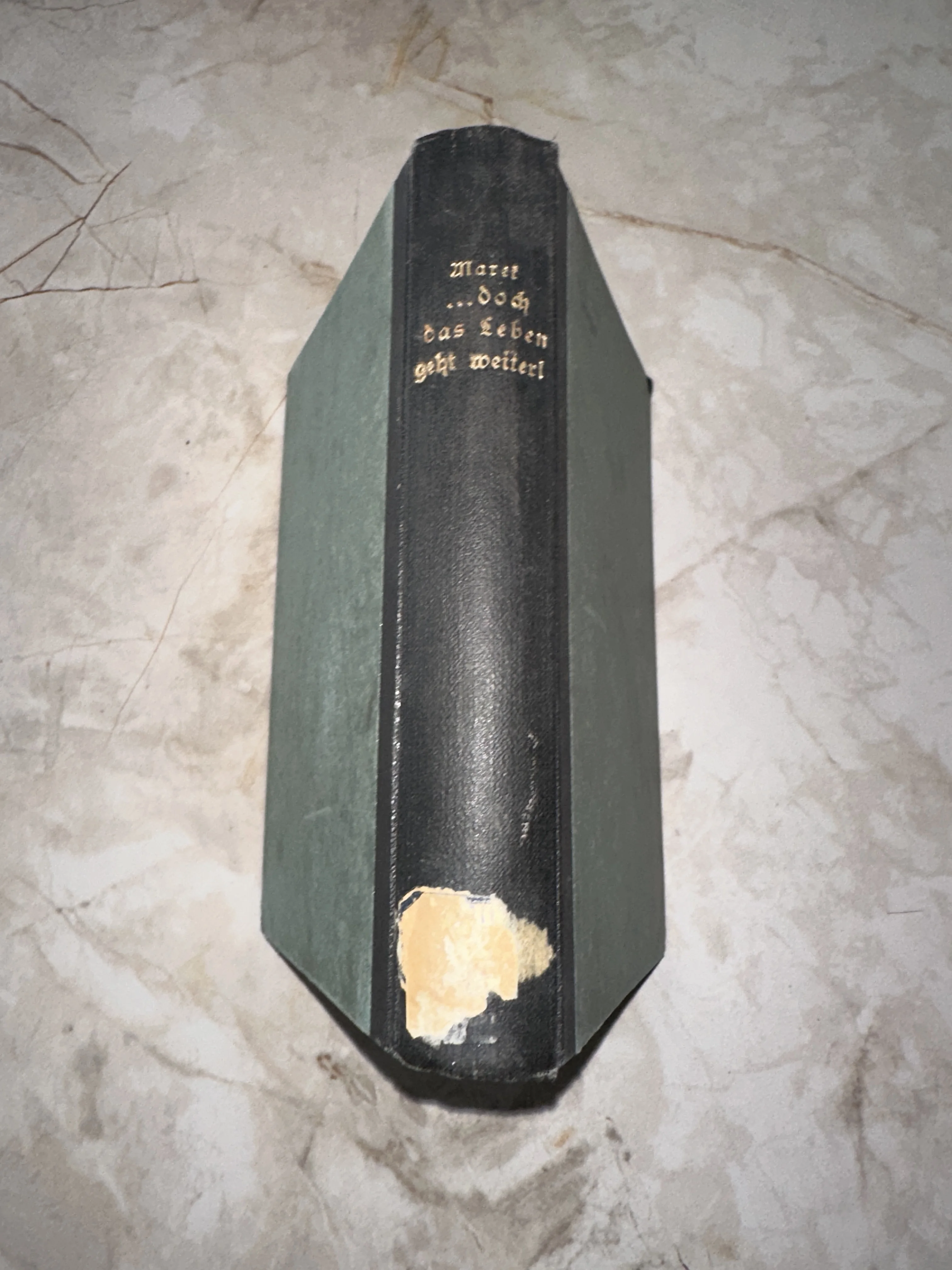 Этот экземпляр — живое свидетельство эпохи, облаченное в строгий полукожаный переплет с благородным золотым тиснением. Немецкое заглавие «...doch das Leben geht weiter!» настраивает на философский лад, а естественные следы времени на корешке лишь подчеркивают подлинность и богатую историю издания.