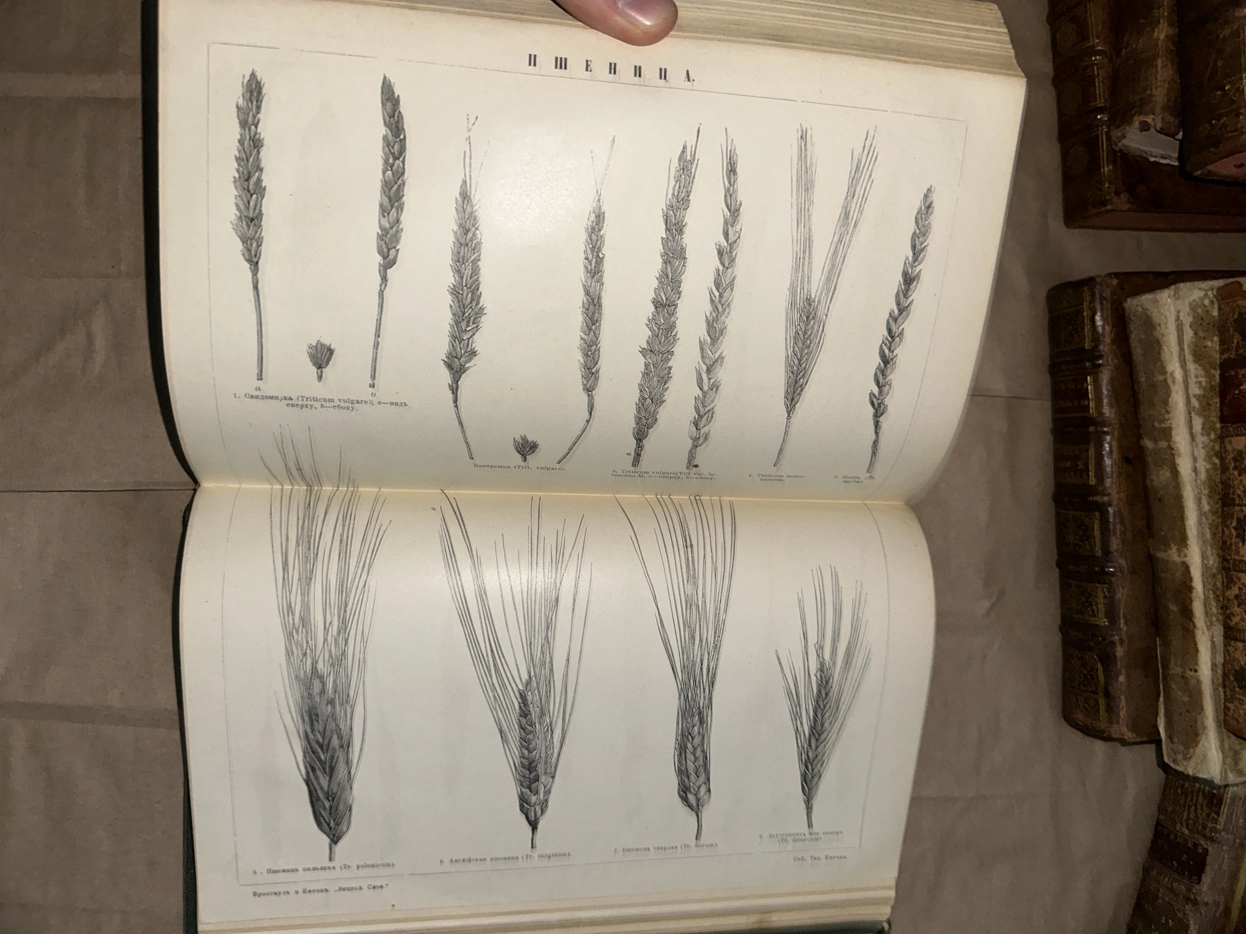 Перед вами аутентичная страница из фундаментального энциклопедического словаря Брокгауза и Ефрона, посвященная видам пшеницы. Тончайшая прорисовка деталей и строгая академическая эстетика превращают научную иллюстрацию в настоящее произведение книжного искусства конца XIX века. Желтоватая патина бумаги лишь подчеркивает почтенный возраст и историческую ценность этого экземпляра.