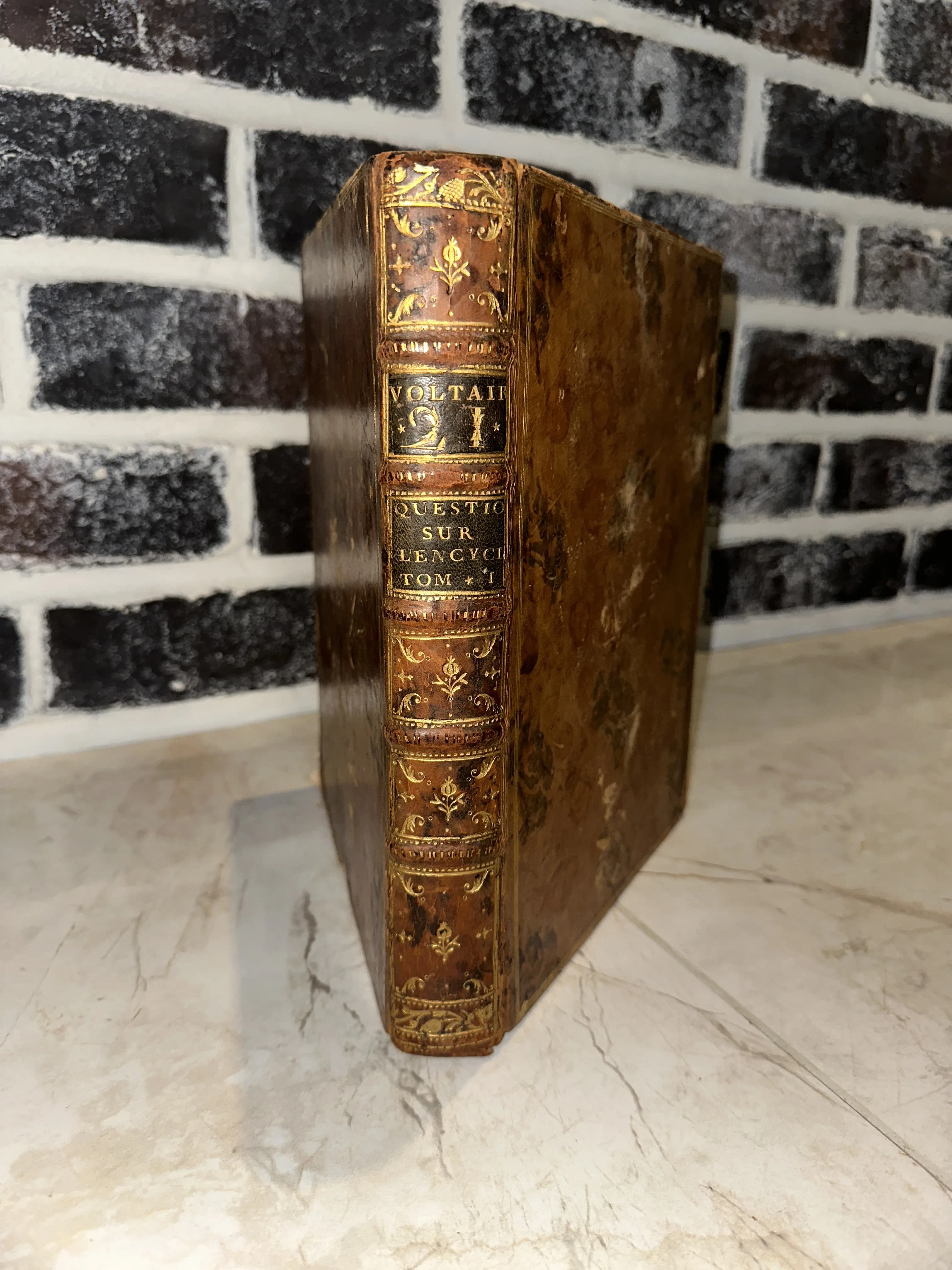 Изысканный образец книжного искусства XVIII столетия в оригинальном цельнокожаном переплете с богатым золотым тиснением. Патина времени и характерные потертости придают этому первому тому «Вопросов к Энциклопедии» особую коллекционную аутентичность и исторический шарм.