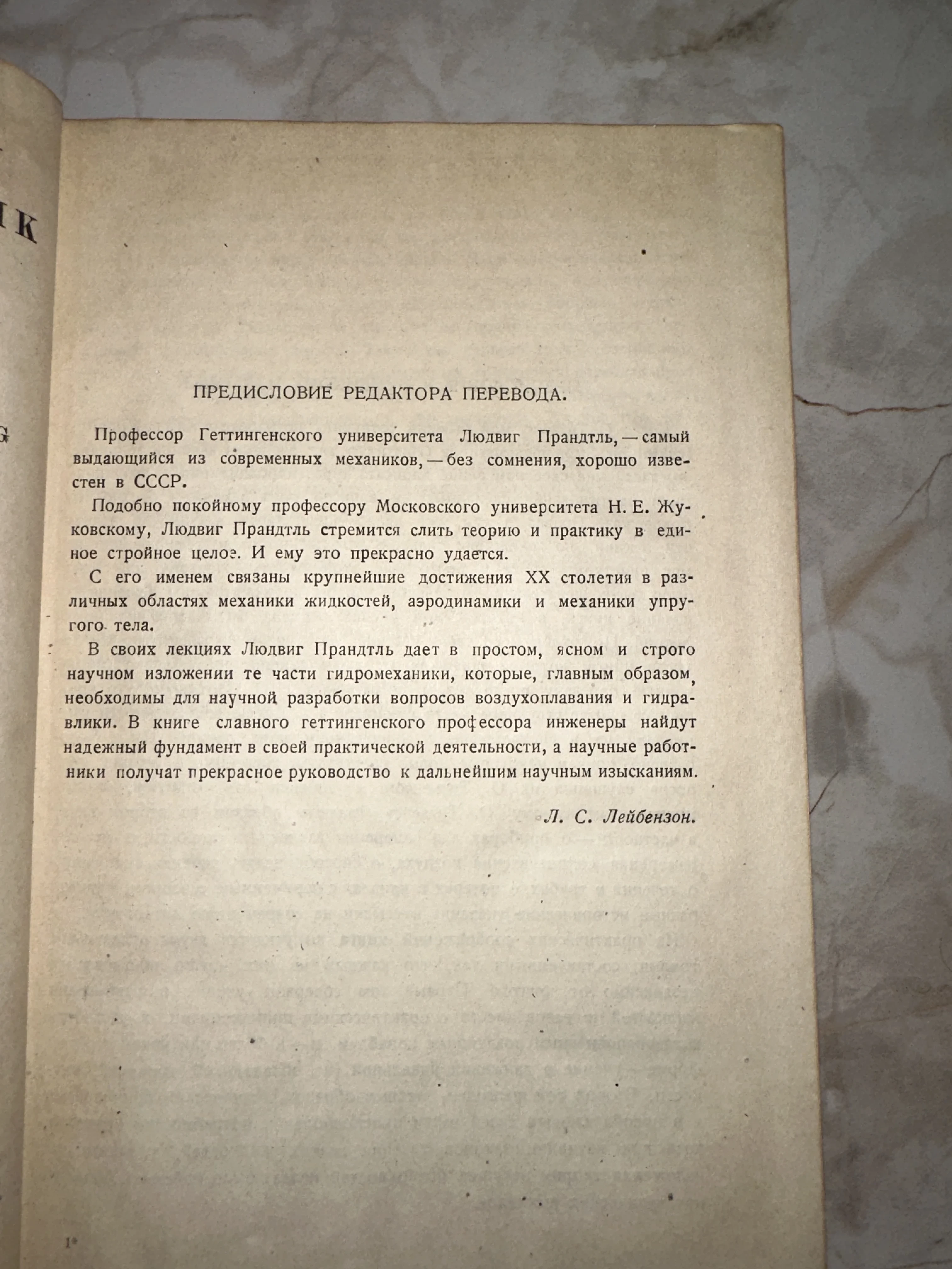 Перед вами подлинный артефакт истории науки — страница с предисловием к изданию работ легендарного механика Людвига Прандтля. Желтоватая бумага и классическая советская типографика передают дух эпохи великих открытий в области аэродинамики и гидромеханики. Текст отлично сохранился, представляя коллекционную ценность для любителей редких научных изданий.