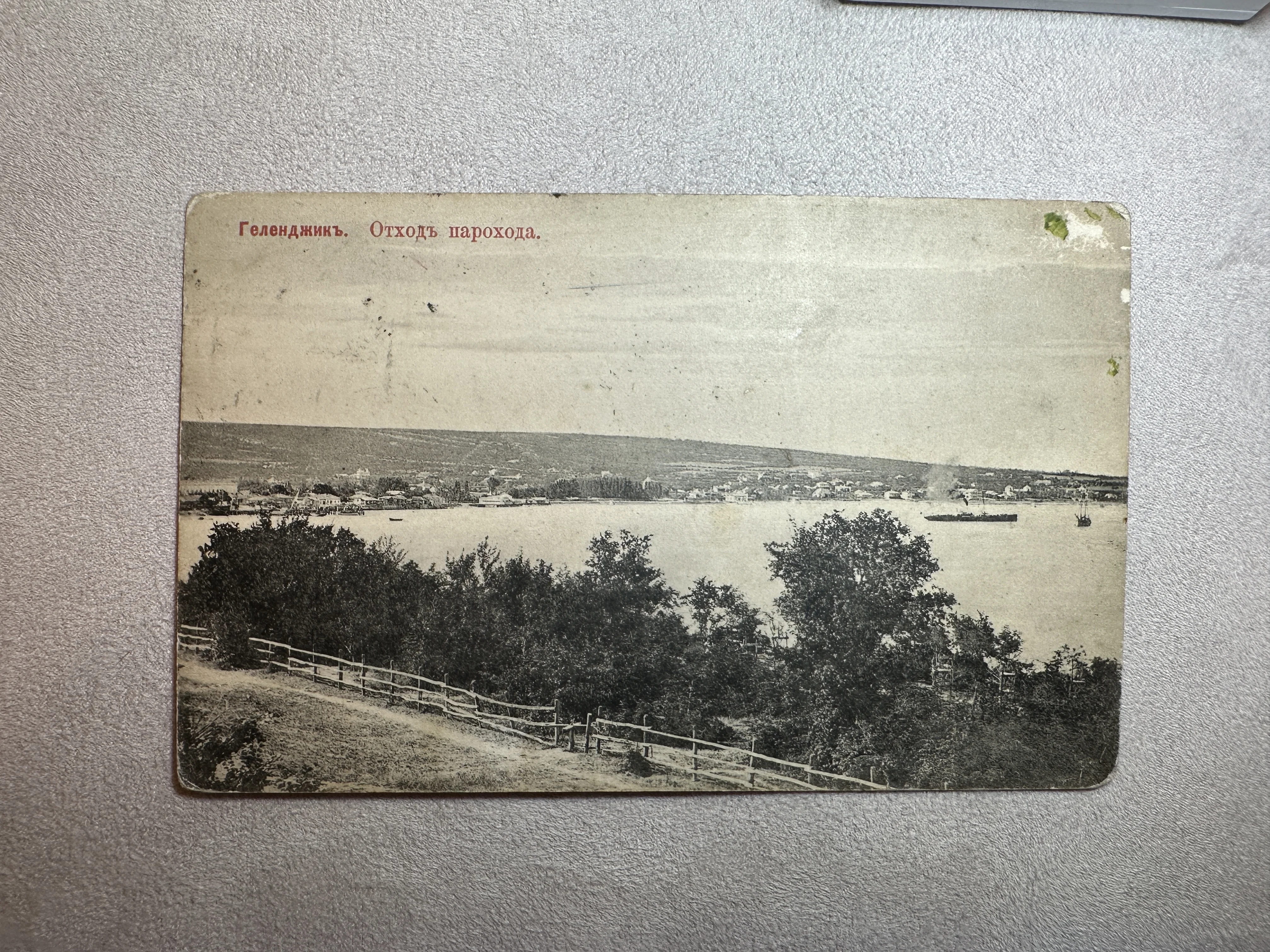 Уникальный образец видовой почтовой карточки начала XX века, передающий безмятежную атмосферу старого курорта. На снимке запечатлен момент отплытия судна из Геленджикской бухты на фоне живописных горных склонов. Коллекционное состояние с характерными следами времени подчеркивает подлинность и историческую ценность предмета.