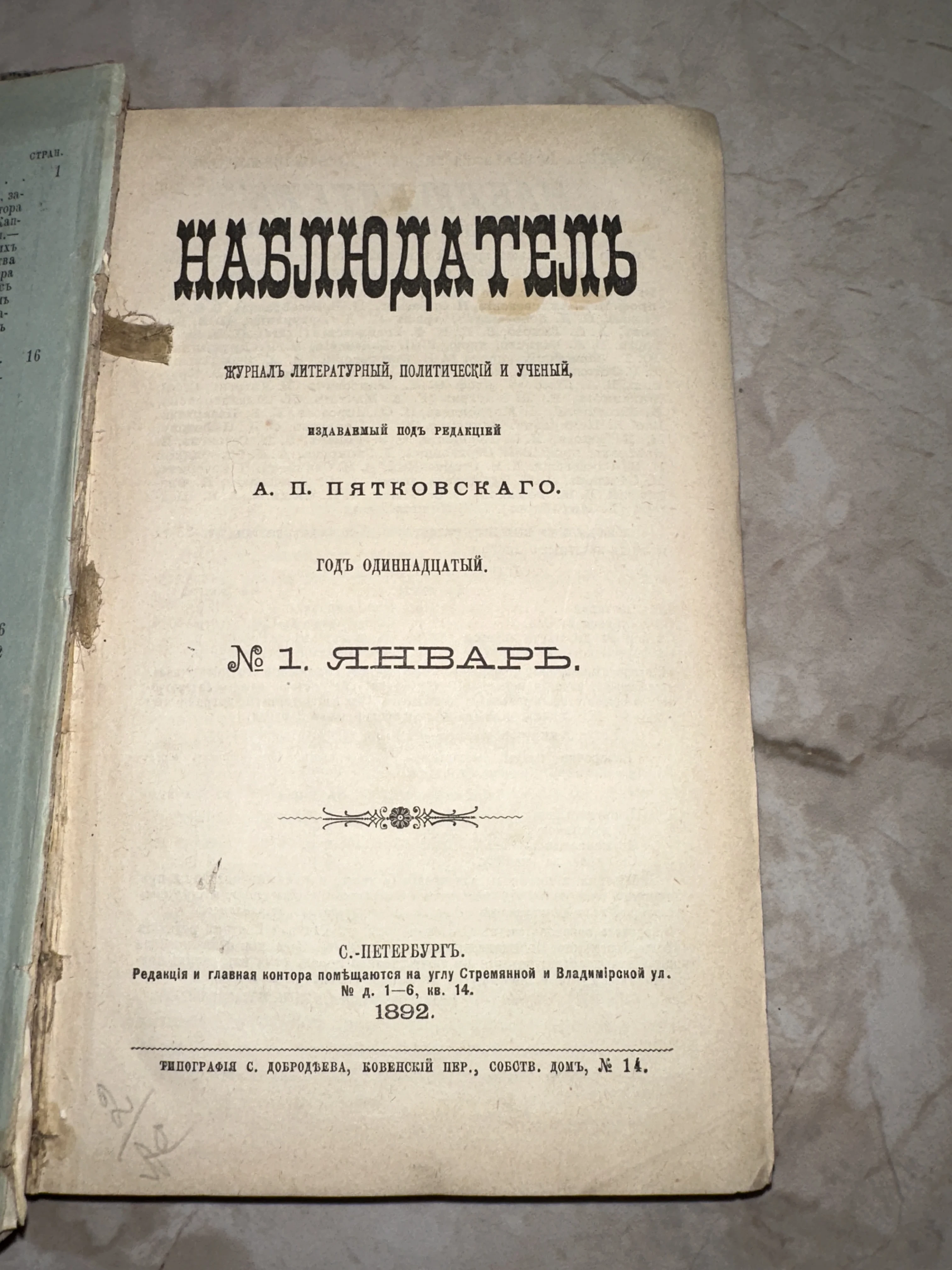 Литературный и политический журнал «Наблюдатель», январь 1892 года
