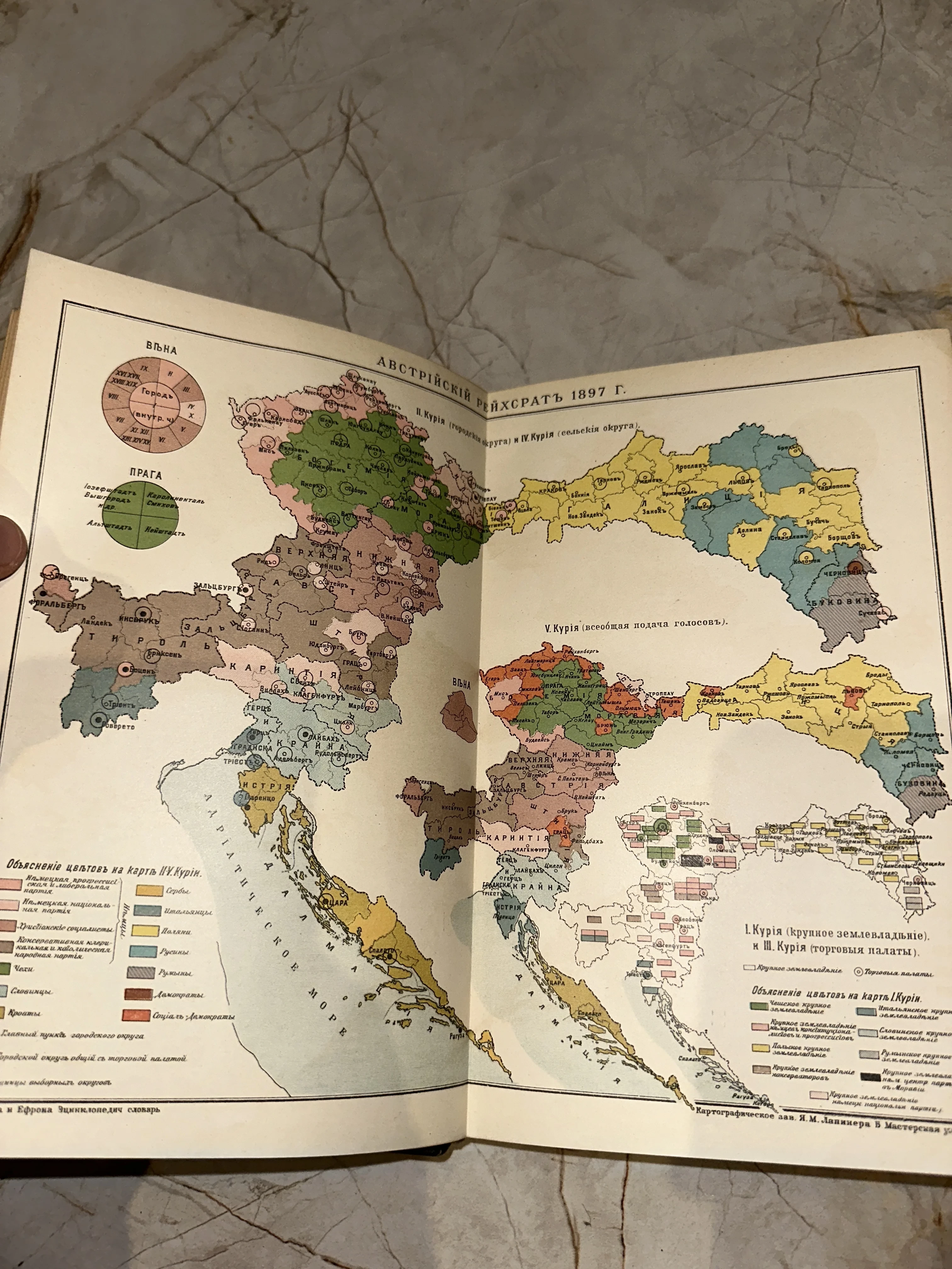 Уникальный образец дореволюционной картографии, детально отображающий результаты выборов и политический ландшафт Австрии 1897 года. Цветная печать отлично сохранилась, передавая все нюансы сложного административного деления империи — от Вены до Далмации. Редкий документ эпохи из энциклопедии Брокгауза и Ефрона, представляющий высокую историческую и коллекционную ценность.