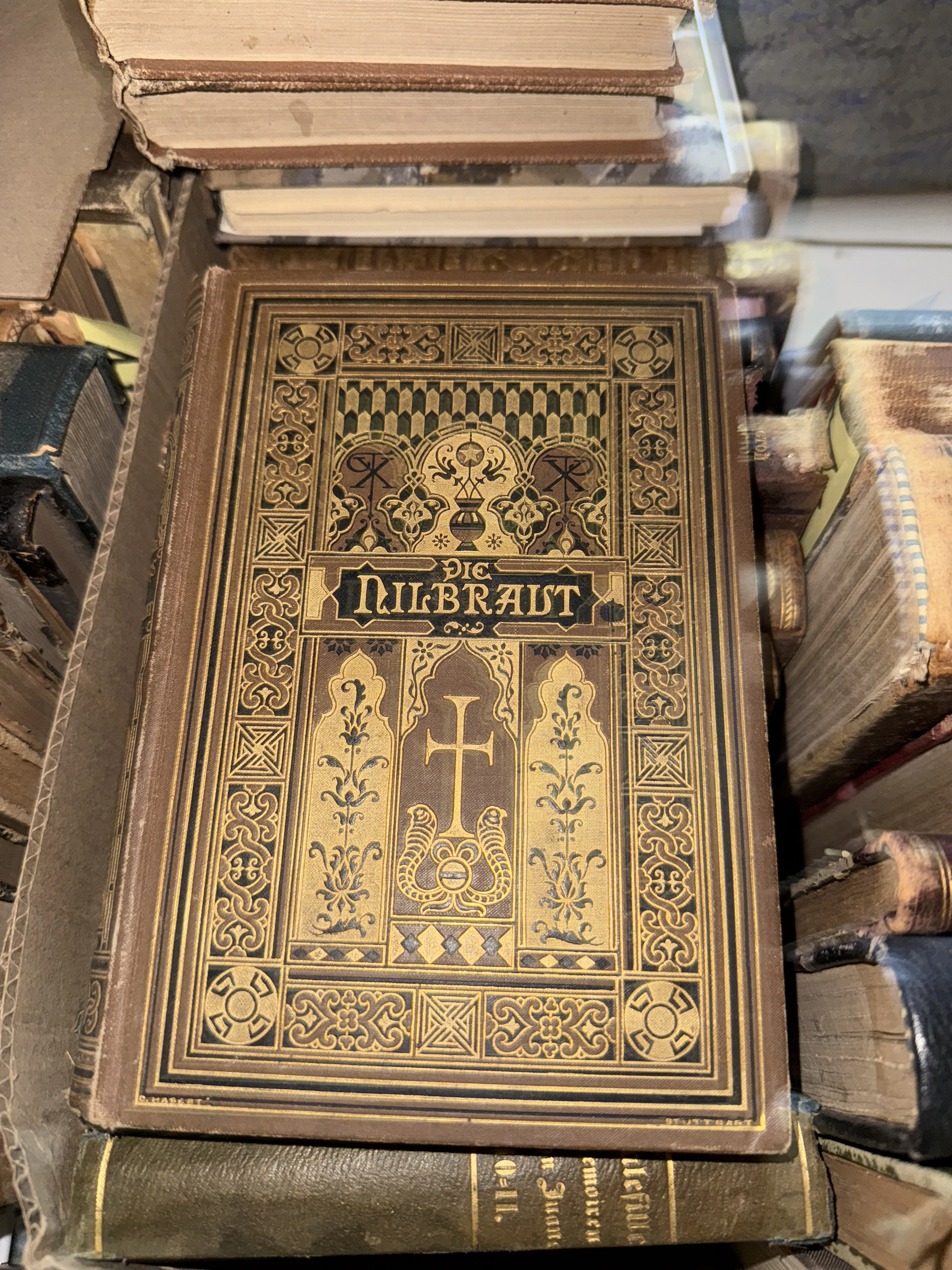 Старинная книга в твердом переплете с богатым золотым тиснением и орнаментом, название Die Nilbraut на немецком языке.