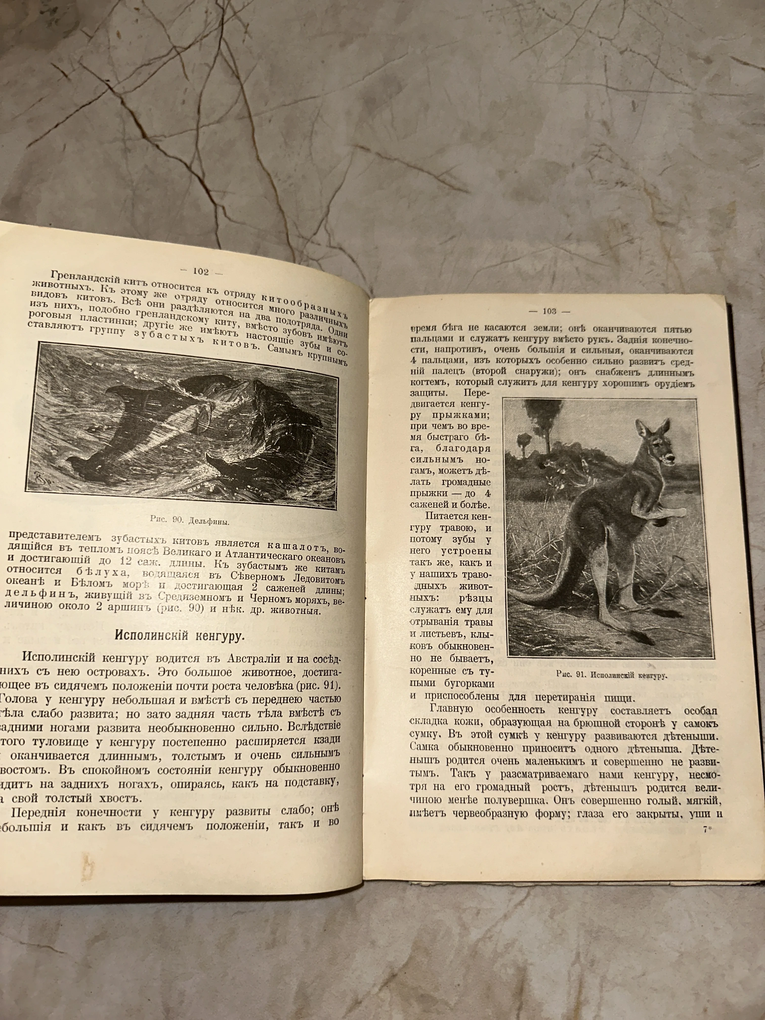 Этот редкий разворот из антикварного издания погружает в атмосферу научных открытий рубежа XIX–XX веков. Страницы украшены детальными гравюрами дельфинов и исполинского кенгуру, сопровождаемыми увлекательным описанием на классическом дореволюционном языке. Благородная патина времени и сохранность шрифтов делают этот экземпляр ценным приобретением для коллекционеров старинной литературы.