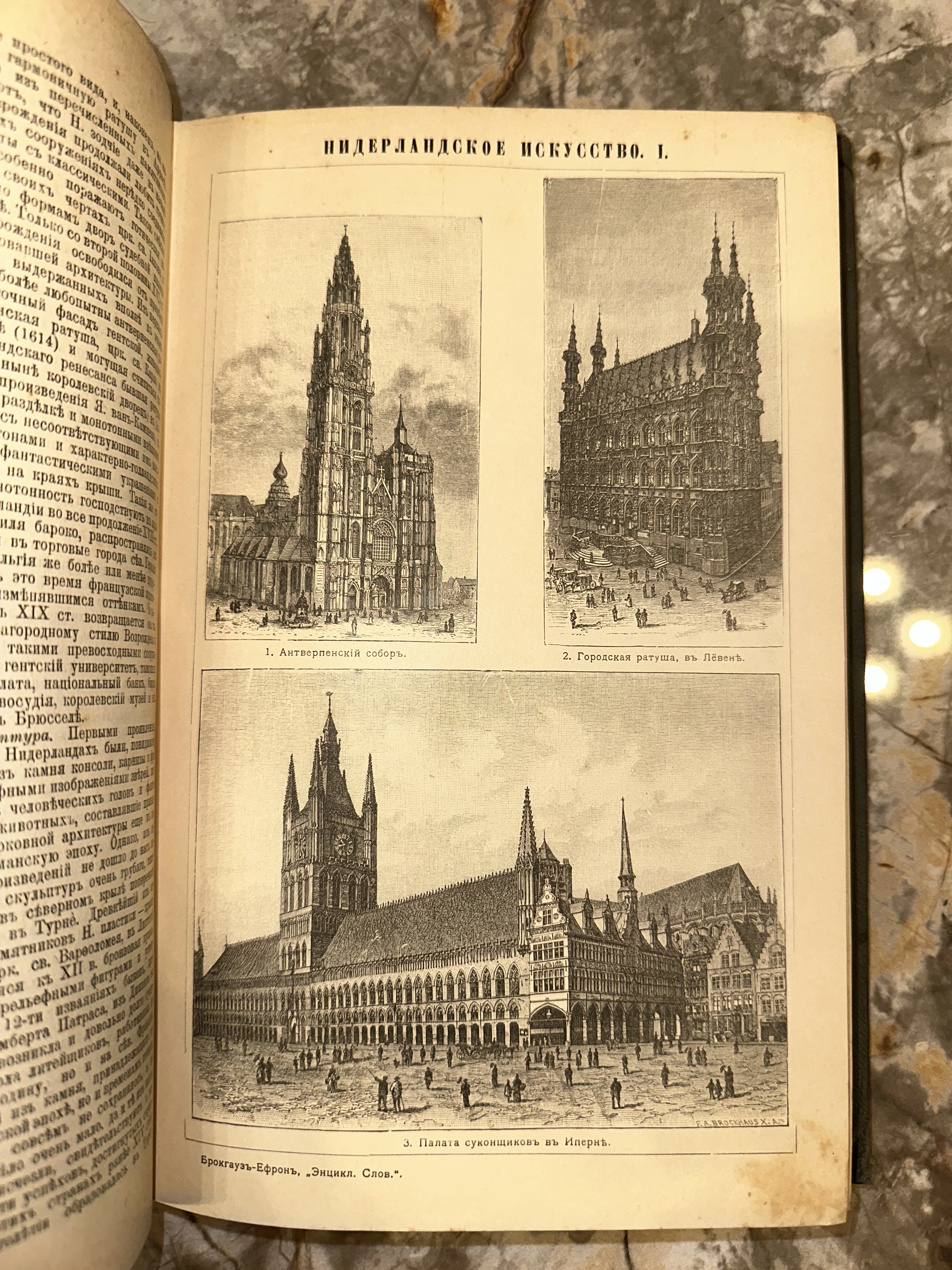 Оригинальный лист из фундаментального энциклопедического словаря Брокгауза и Ефрона, представляющий шедевры готического зодчества Нидерландов. Детализированные гравюры с ювелирной точностью передают величие старинных соборов и ратуш, сохраняя атмосферу европейской истории. Бумага обладает благородным кремовым оттенком, характерным для подлинных изданий конца XIX — начала XX века.