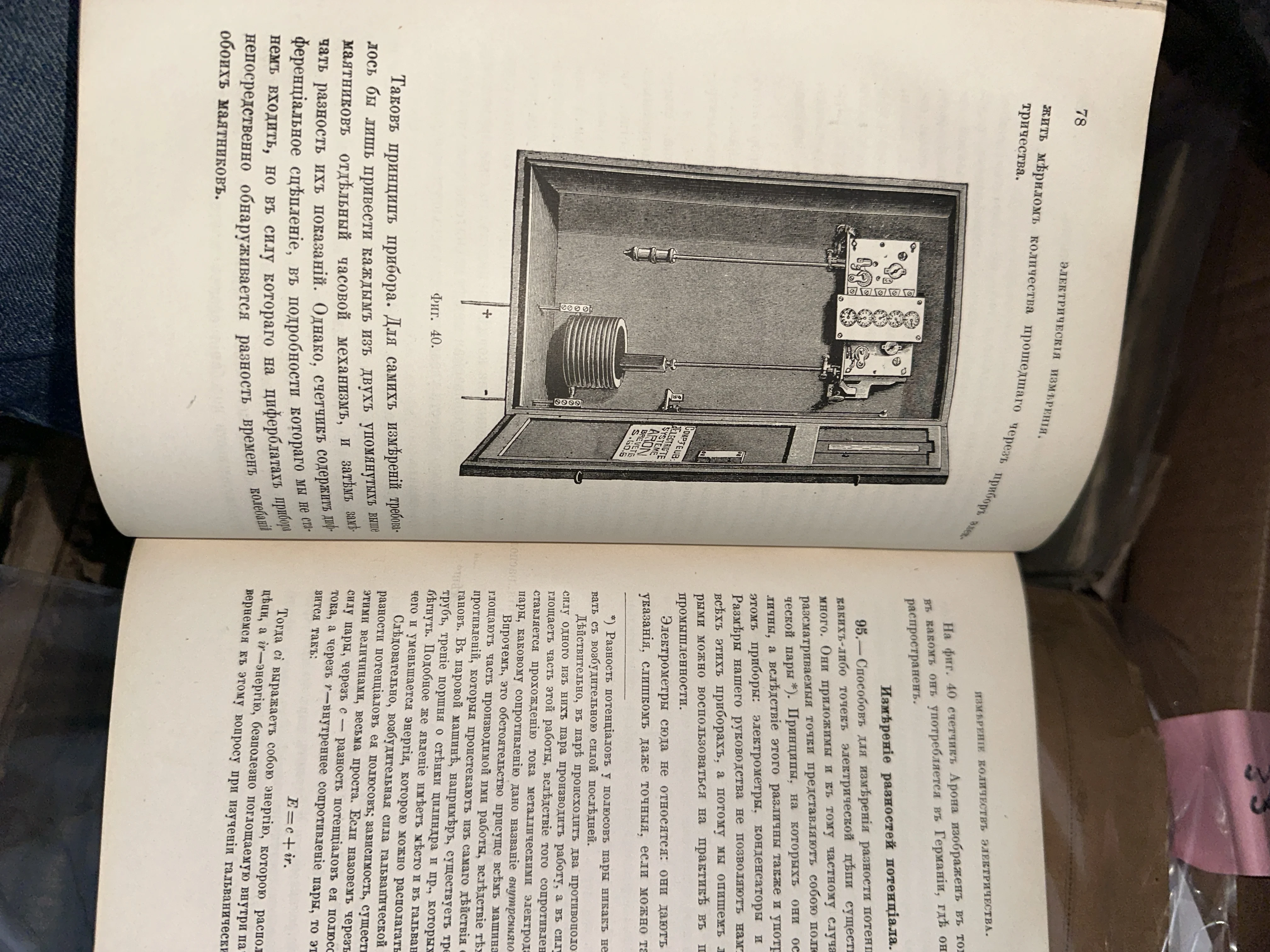 Разворот старинной книги с технической иллюстрацией электрического счетчика Арона и текстом на дореволюционном русском языке.