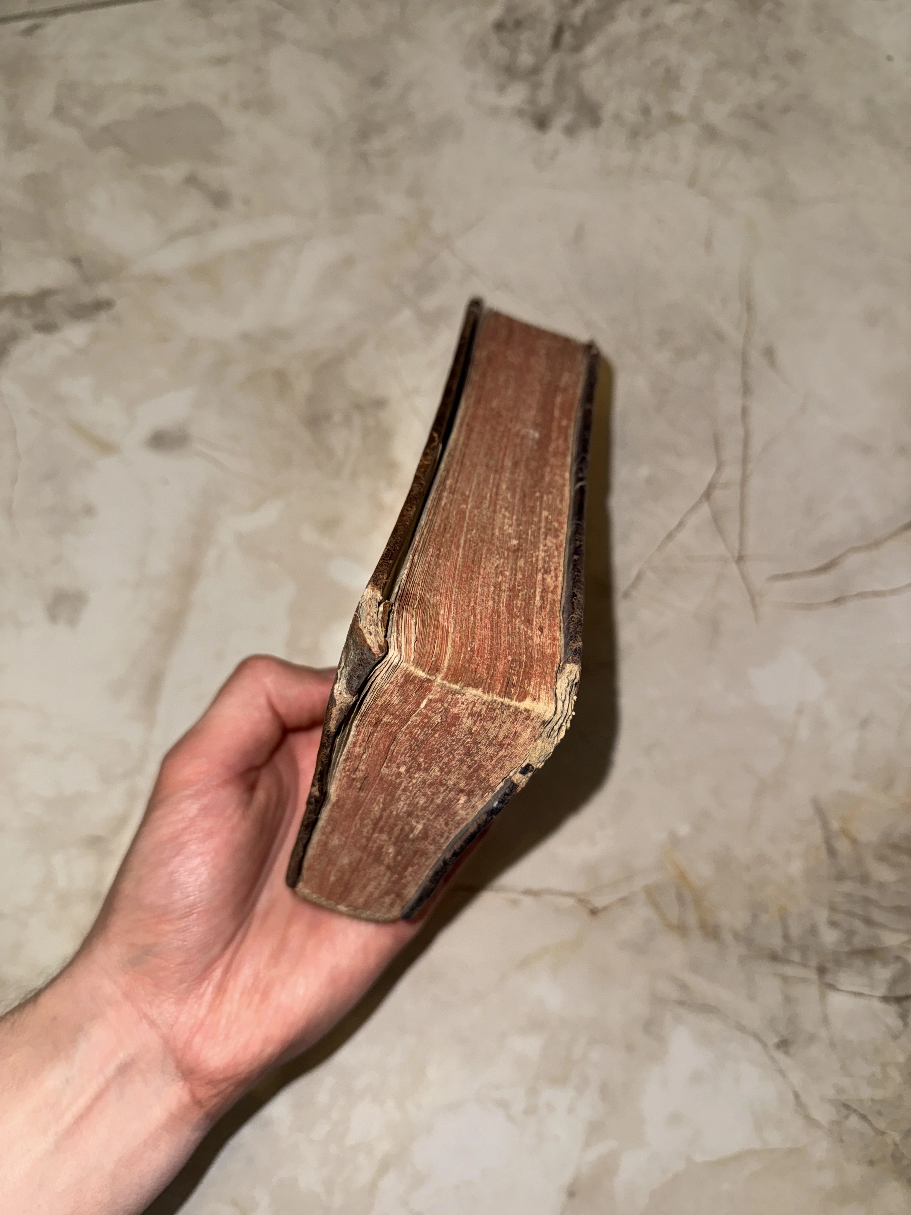 Этот редкий экземпляр поражает своей толщиной и благородной патиной времени на пожелтевших обрезах страниц. Увесистый том в аутентичном переплете с характерными следами бытования станет ценным приобретением для истинного ценителя книжной старины.
