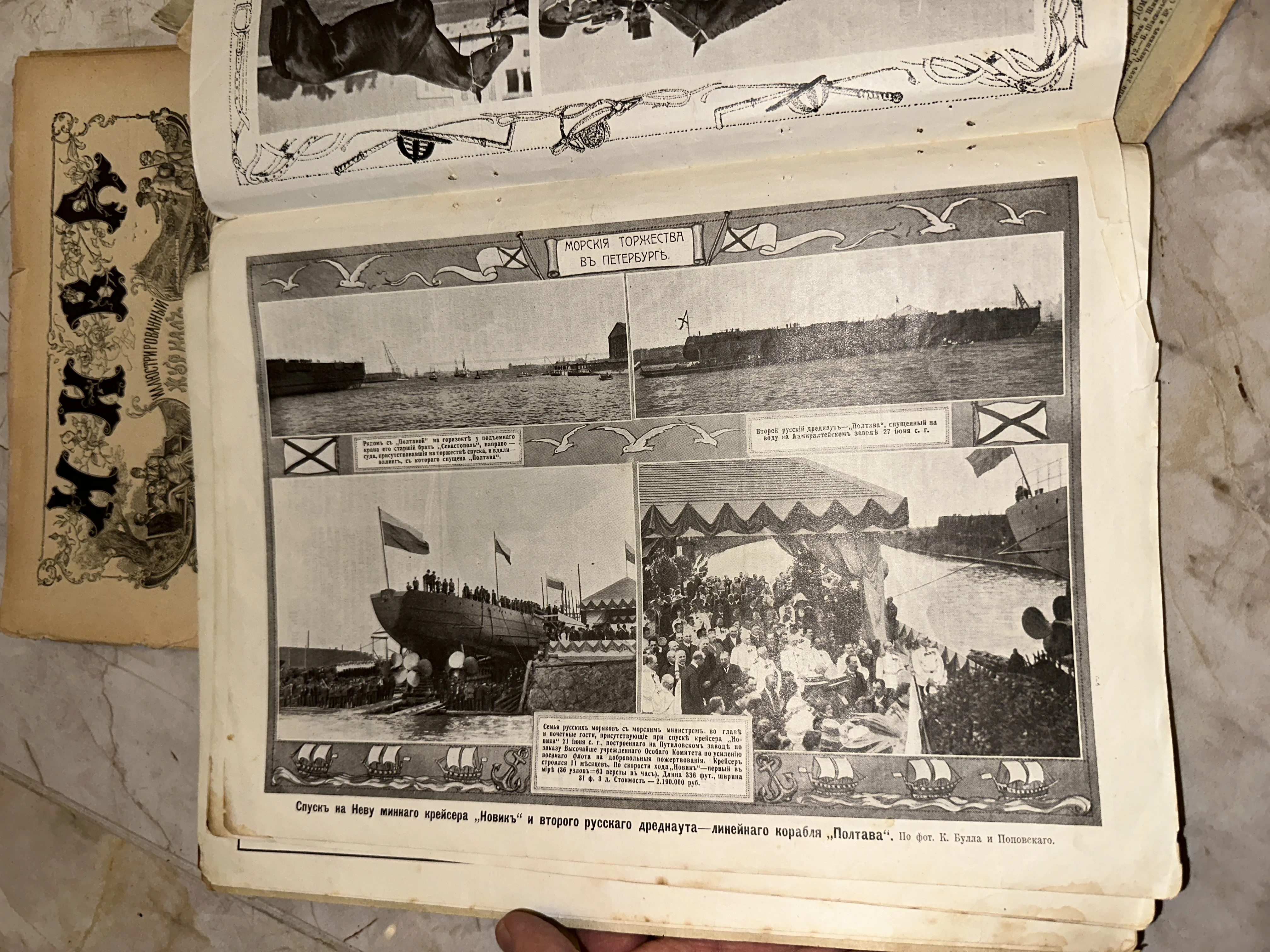 Редкий исторический разворот иллюстрированного журнала, запечатлевший величие российского флота в 1911 году. На снимках знаменитых фотографов К. Буллы и Поповского оживают моменты спуска на воду легендарного крейсера «Новик» и дредноута «Полтава». Пожелтевшая бумага и детализированные кадры передают подлинную атмосферу дореволюционных торжеств и масштаб инженерной мысли империи.