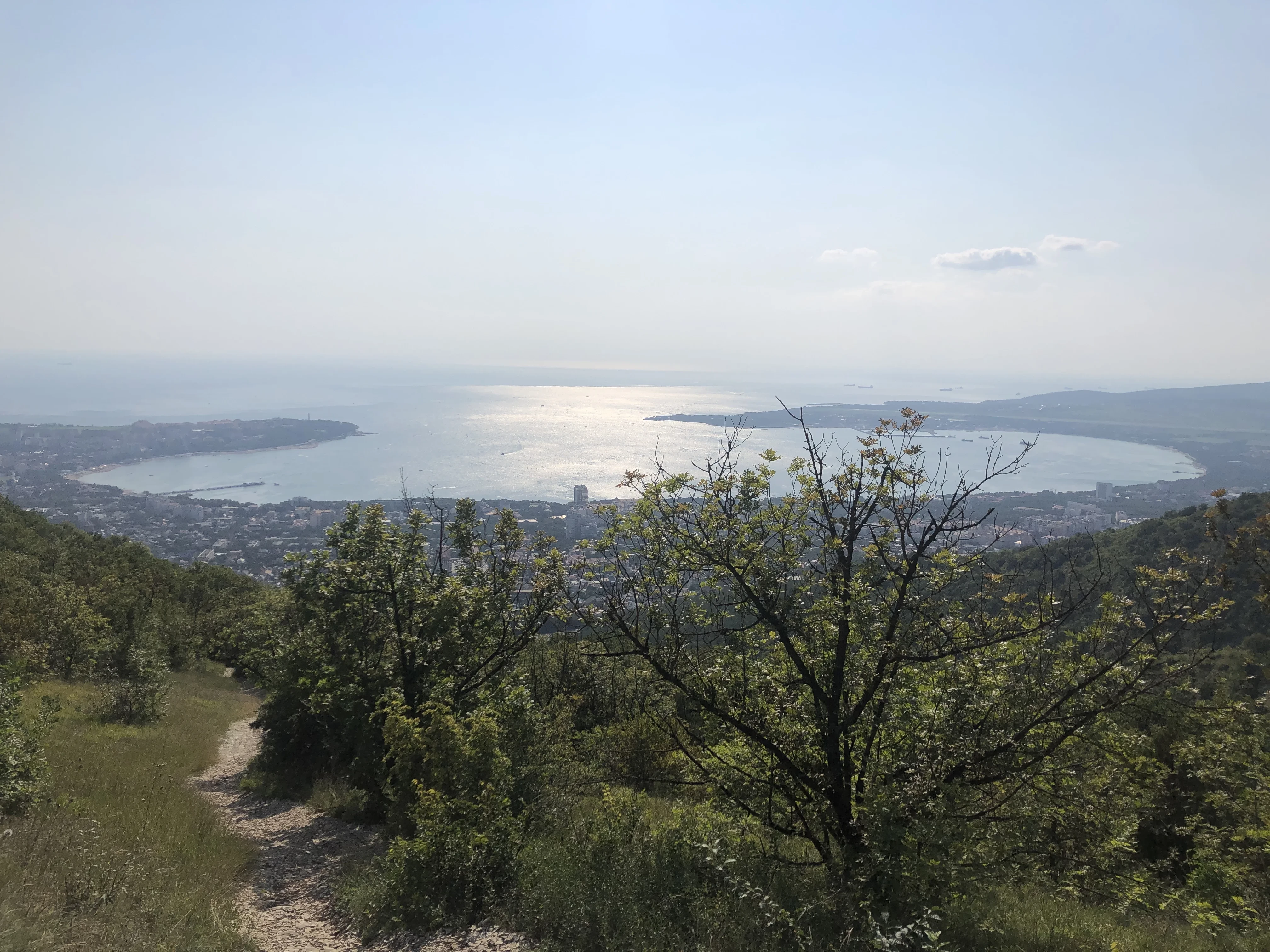 Завораживающая панорама залива, залитого солнечным светом, открывается с высоты птичьего полета. Горная тропа уводит взгляд к лазурной глади воды и уютному прибрежному городу, создавая ощущение безмятежности и бесконечного простора.