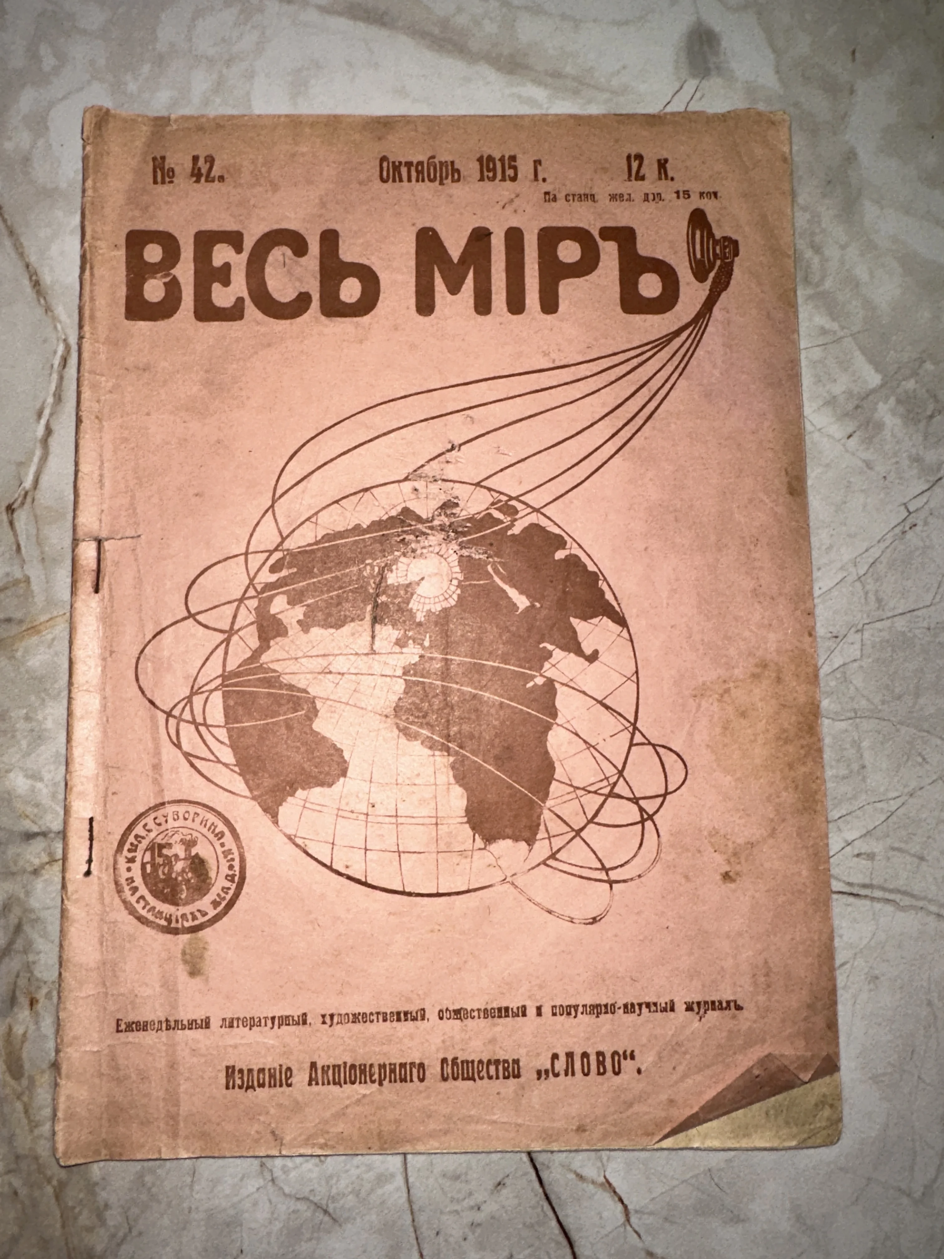 Обложка антикварного журнала Весь Миръ за октябрь 1915 года с изображением земного шара и надписями на дореволюционном русском языке.