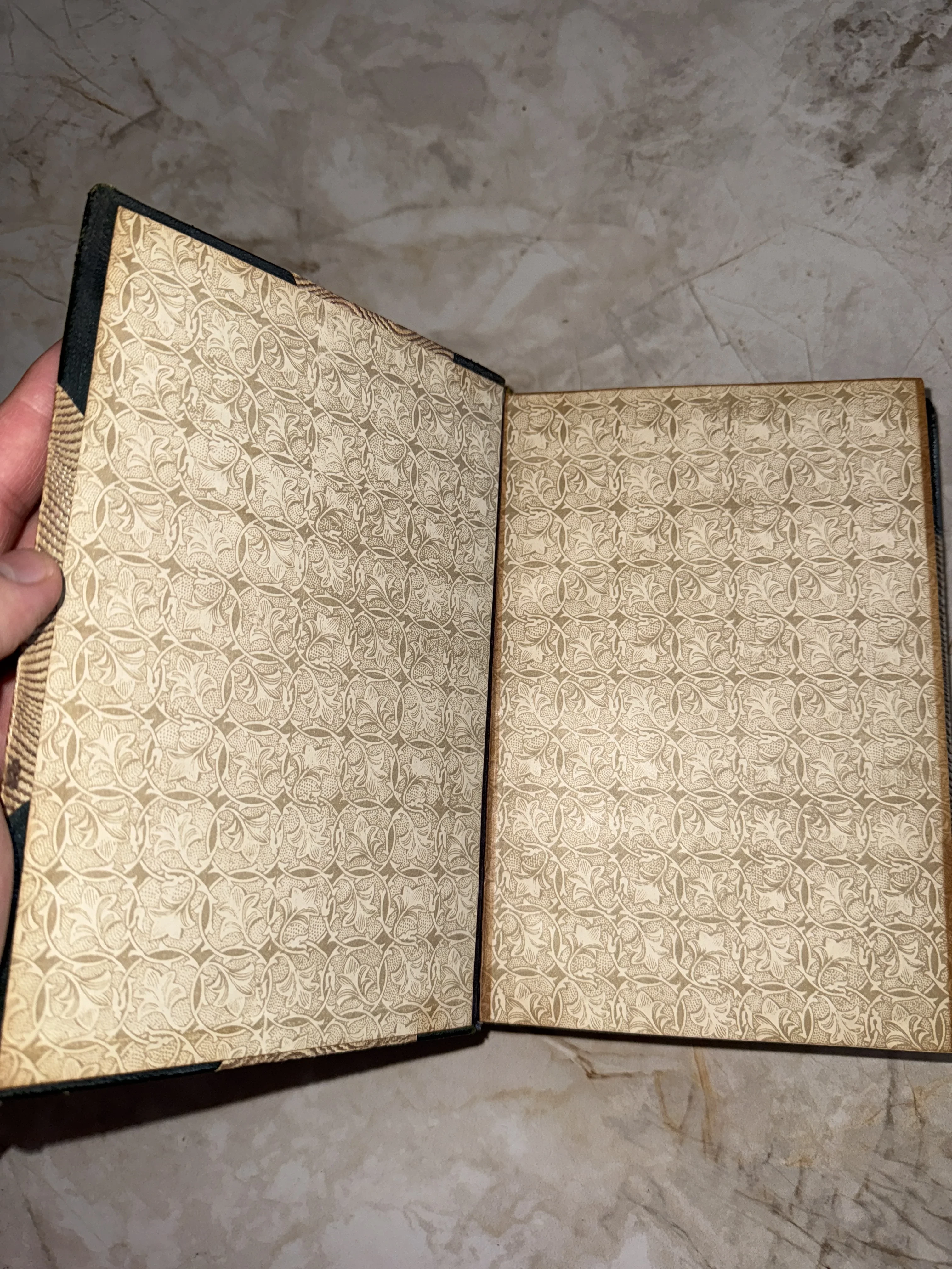 Изящный орнаментальный форзац подчеркивает благородное происхождение этого антикварного тома. Сложный растительный узор и естественная патина времени создают неповторимую атмосферу классической частной библиотеки прошлых веков.