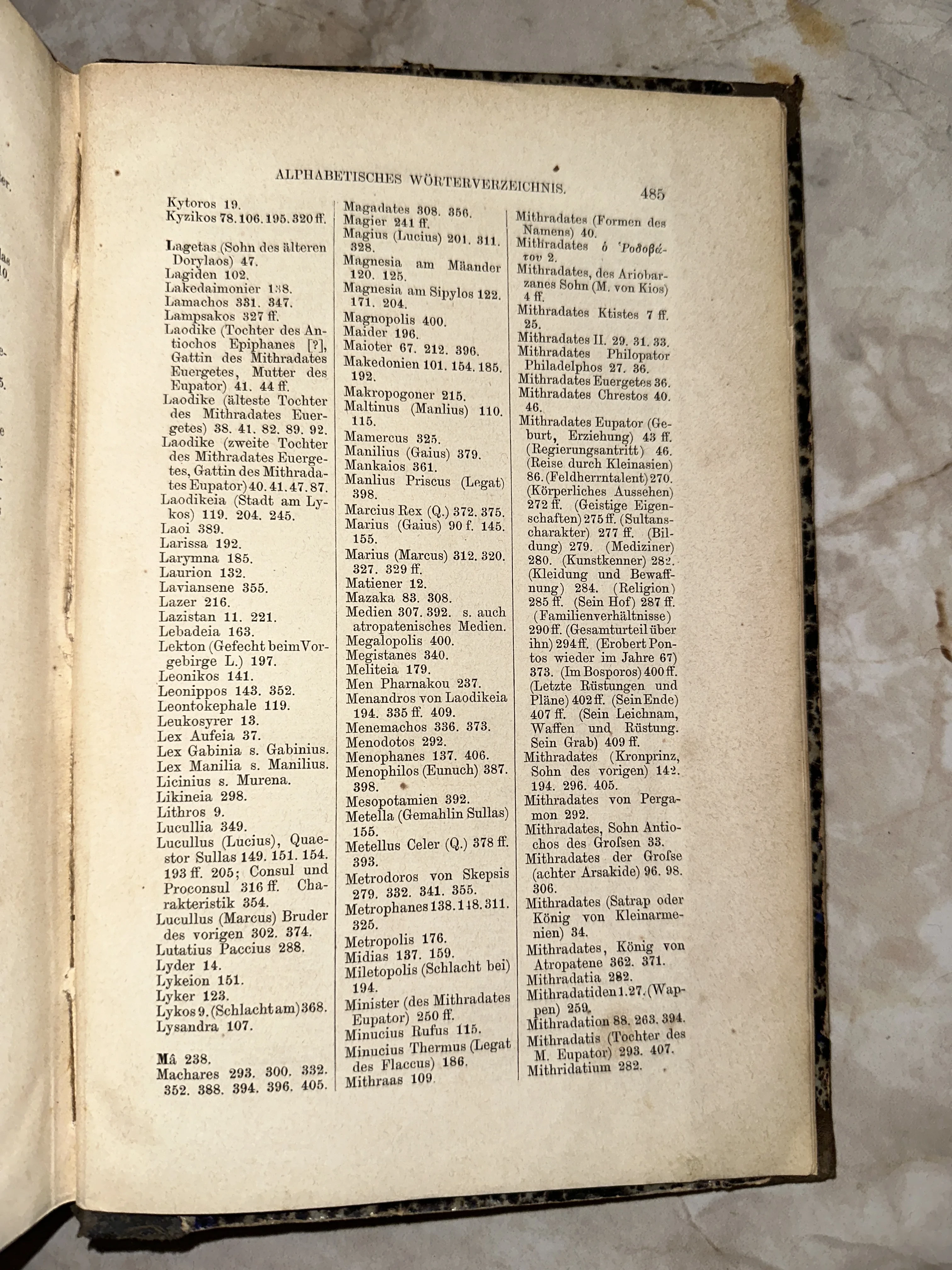 Крупный план страницы 485 из старинной немецкой книги с алфавитным указателем имен и местностей.