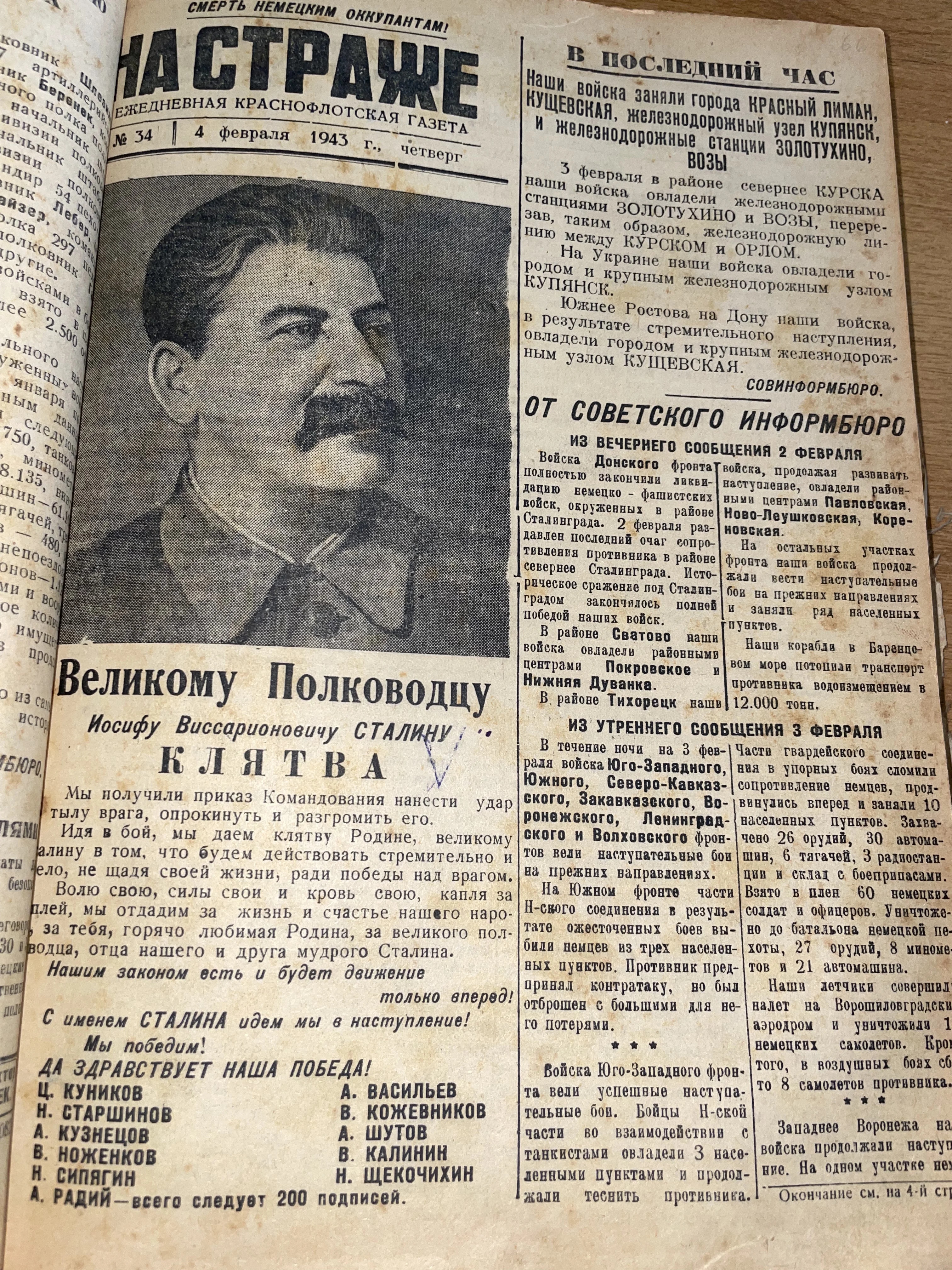 Первая полоса советской краснофлотской газеты «На страже» с портретом Сталина и заголовками о победах Красной армии в 1943 году.