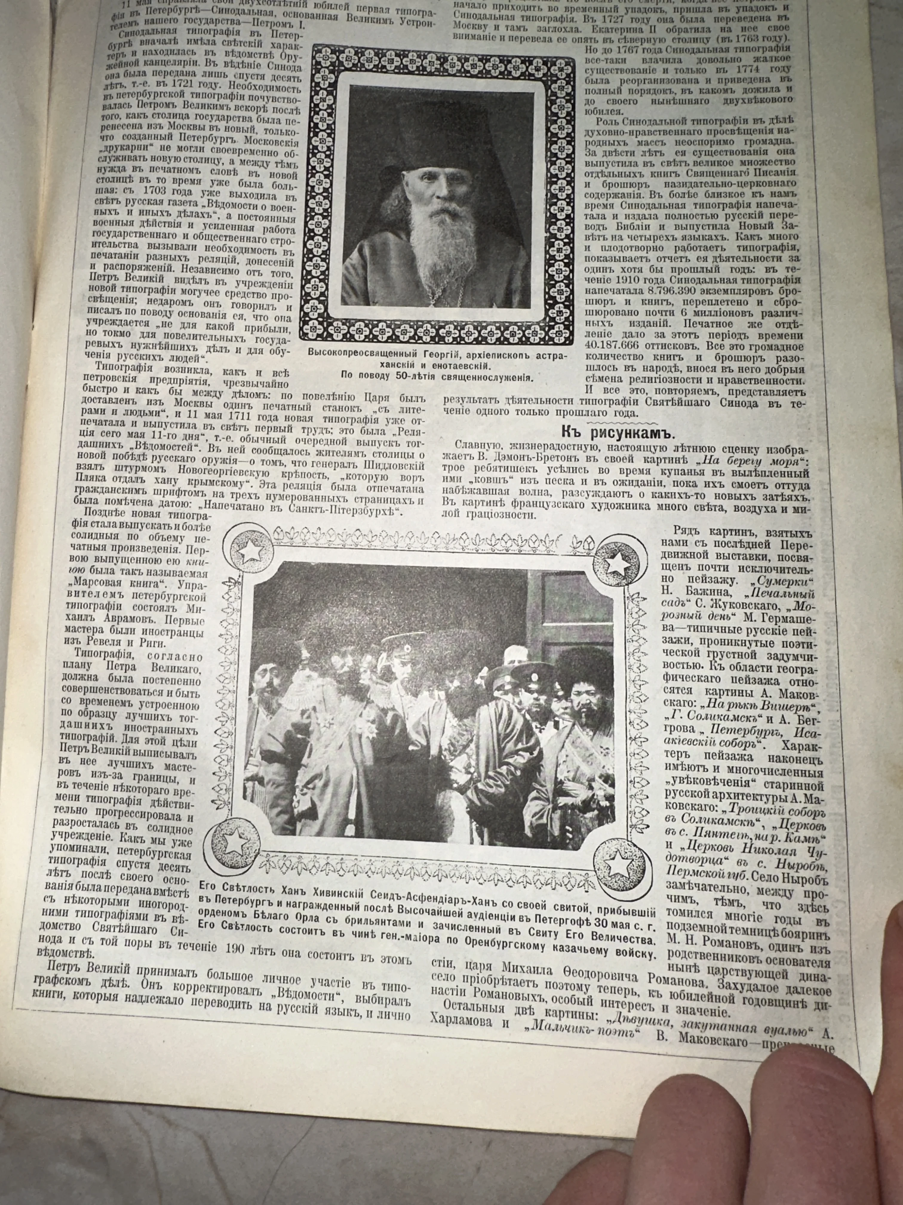 Уникальный фрагмент периодической печати начала XX века, посвященный юбилею Синодальной типографии и официальным визитам высокопоставленных лиц. На странице запечатлены редкие портреты архиепископа Астраханского Георгия и хана Хивинского Сейд-Асфендиар-Хана, выполненные в технике качественной фототипии. Издание обладает высокой исторической и коллекционной ценностью, передавая атмосферу и официальный этикет поздней Российской империи.