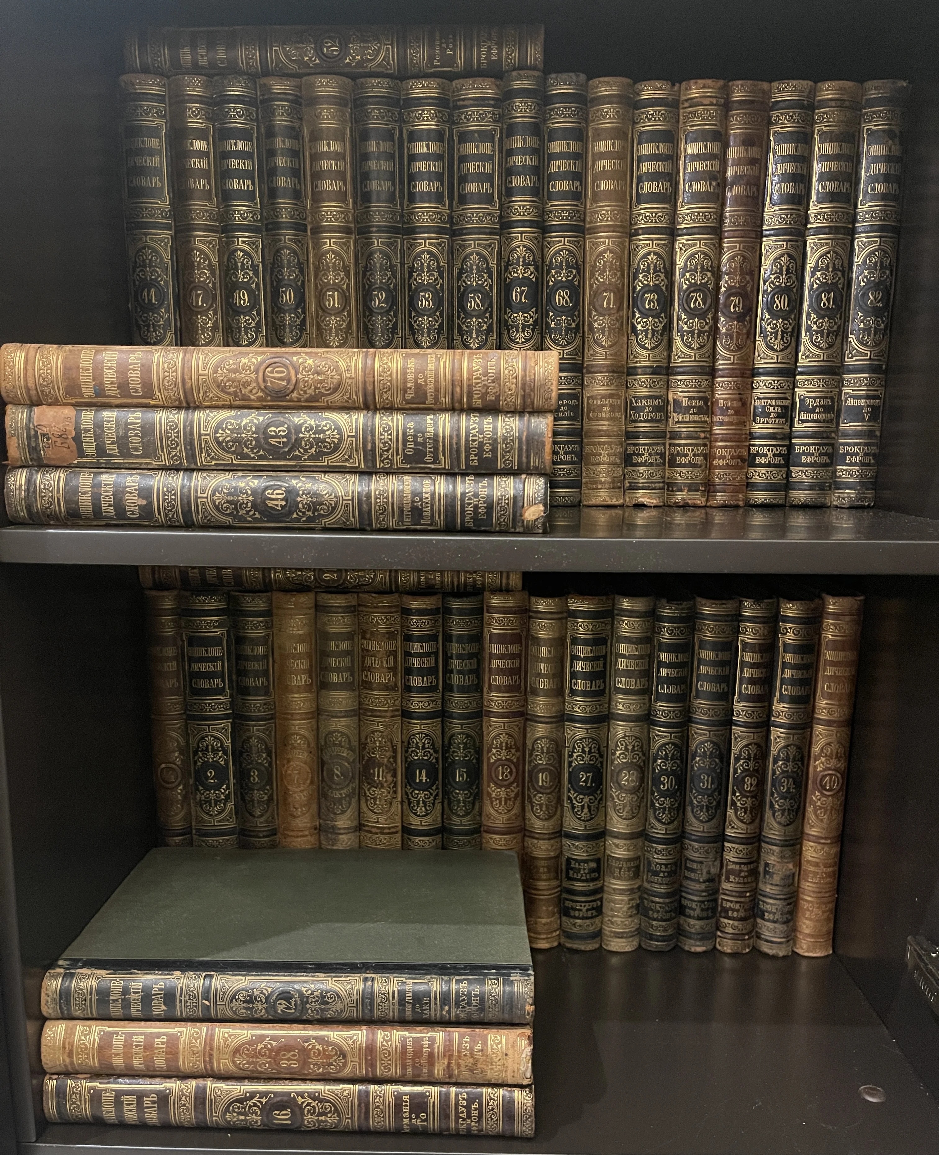 Монументальное собрание легендарного словаря, ставшего символом дореволюционной эрудиции и книжного искусства. Изысканные полукожаные переплеты с богатым золотым тиснением сохранили благородную патину времени, превращая библиотеку в статусное украшение классического интерьера. Эти тома представляют не только высокую коллекционную ценность, но и являются неисчерпаемым источником знаний ушедшей эпохи.