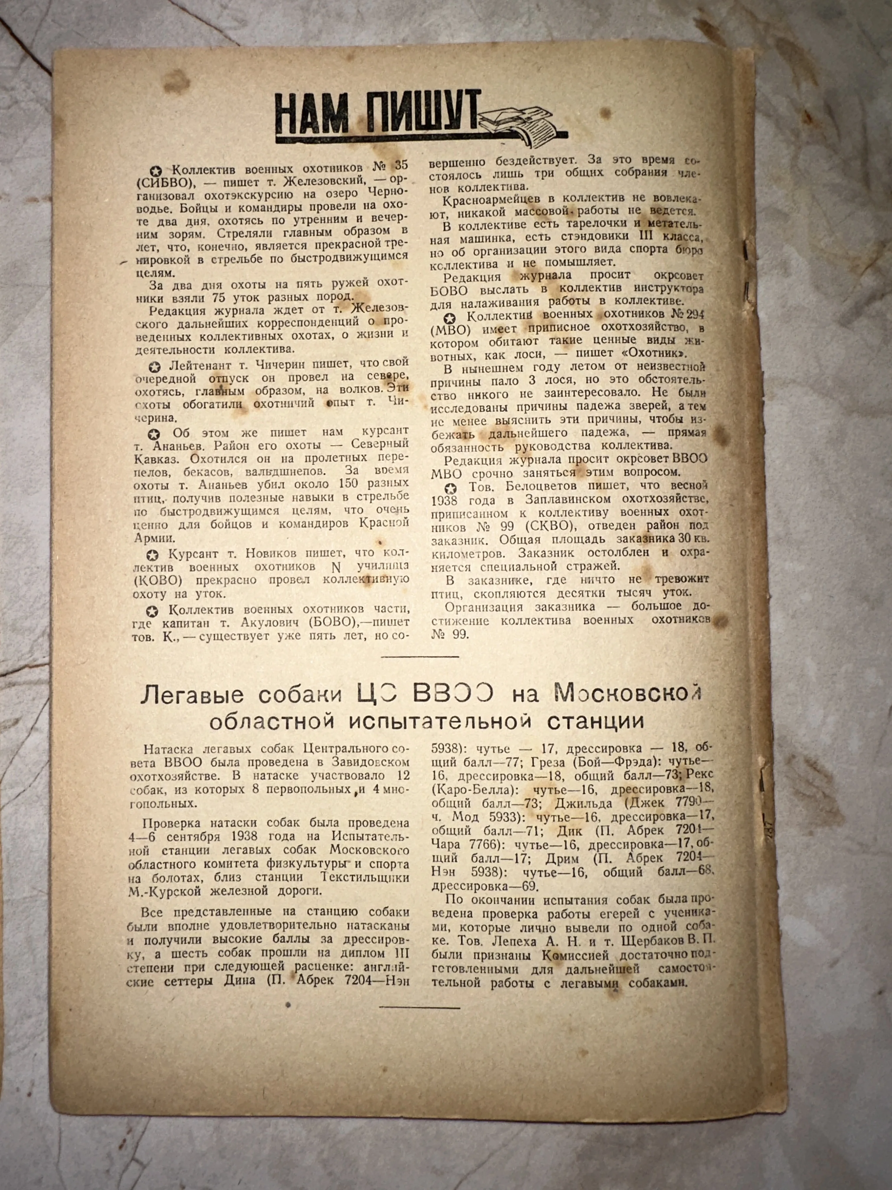 Подлинный артефакт довоенной эпохи — страница из специализированного издания, посвященная деятельности военных охотничьих обществ и результатам натаски легавых собак. Текст содержит уникальные исторические сведения об охотничьих хозяйствах и кинологических испытаниях в Завидово. Пожелтевшая от времени бумага и характерная типографика тридцатых годов передают атмосферу и эстетику советской периодики того времени.
