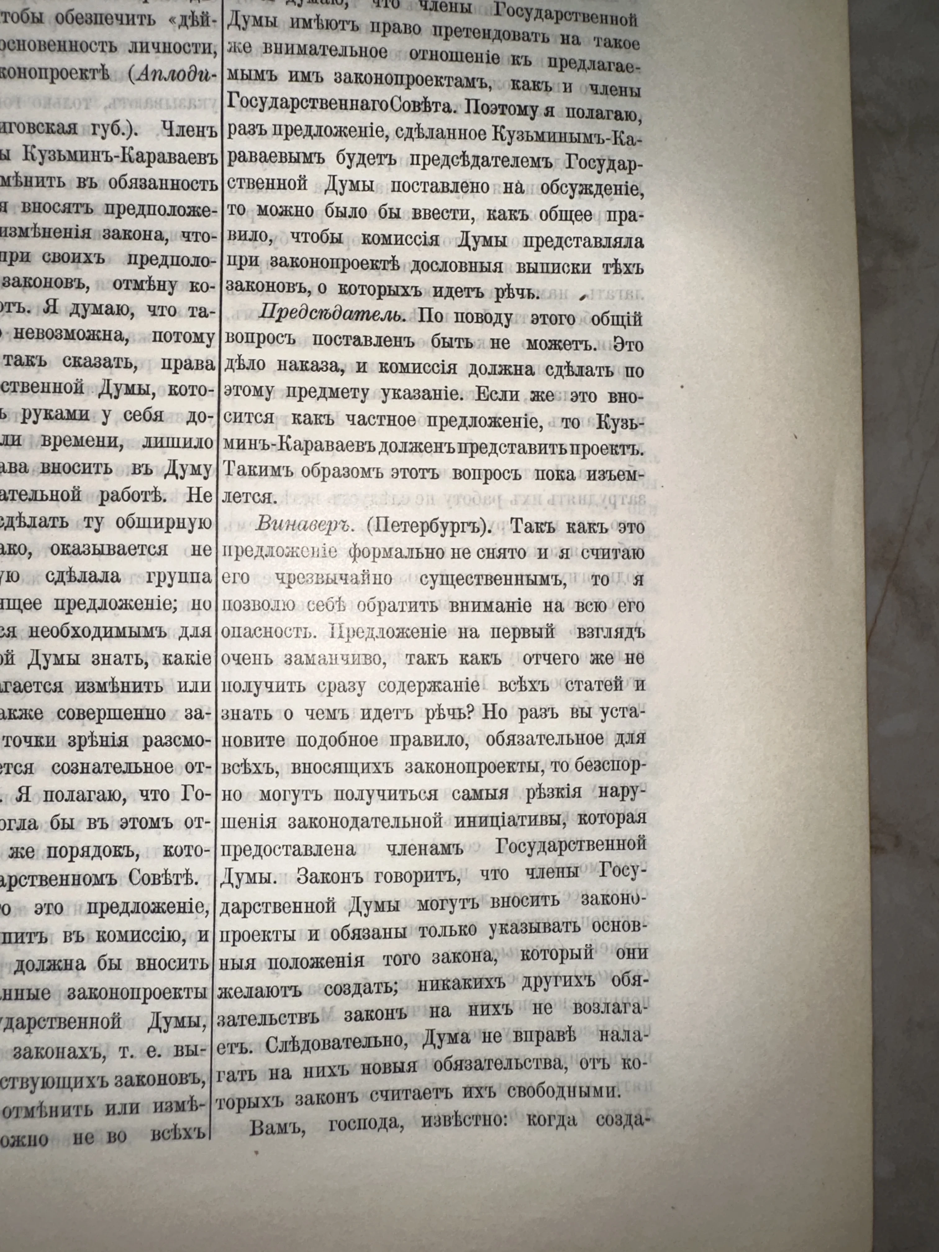 Уникальный фрагмент печатной истории, запечатлевший хронику заседаний Государственной Думы Российской империи начала XX века. Текст, выполненный в дореформенной орфографии, сохранил имена видных политических деятелей той эпохи, таких как Кузьмин-Караваев и Винавер. Плотная бумага с благородным оттенком старины и четкая антикварная типографика делают этот экземпляр ценным артефактом для коллекционеров и исследователей права.