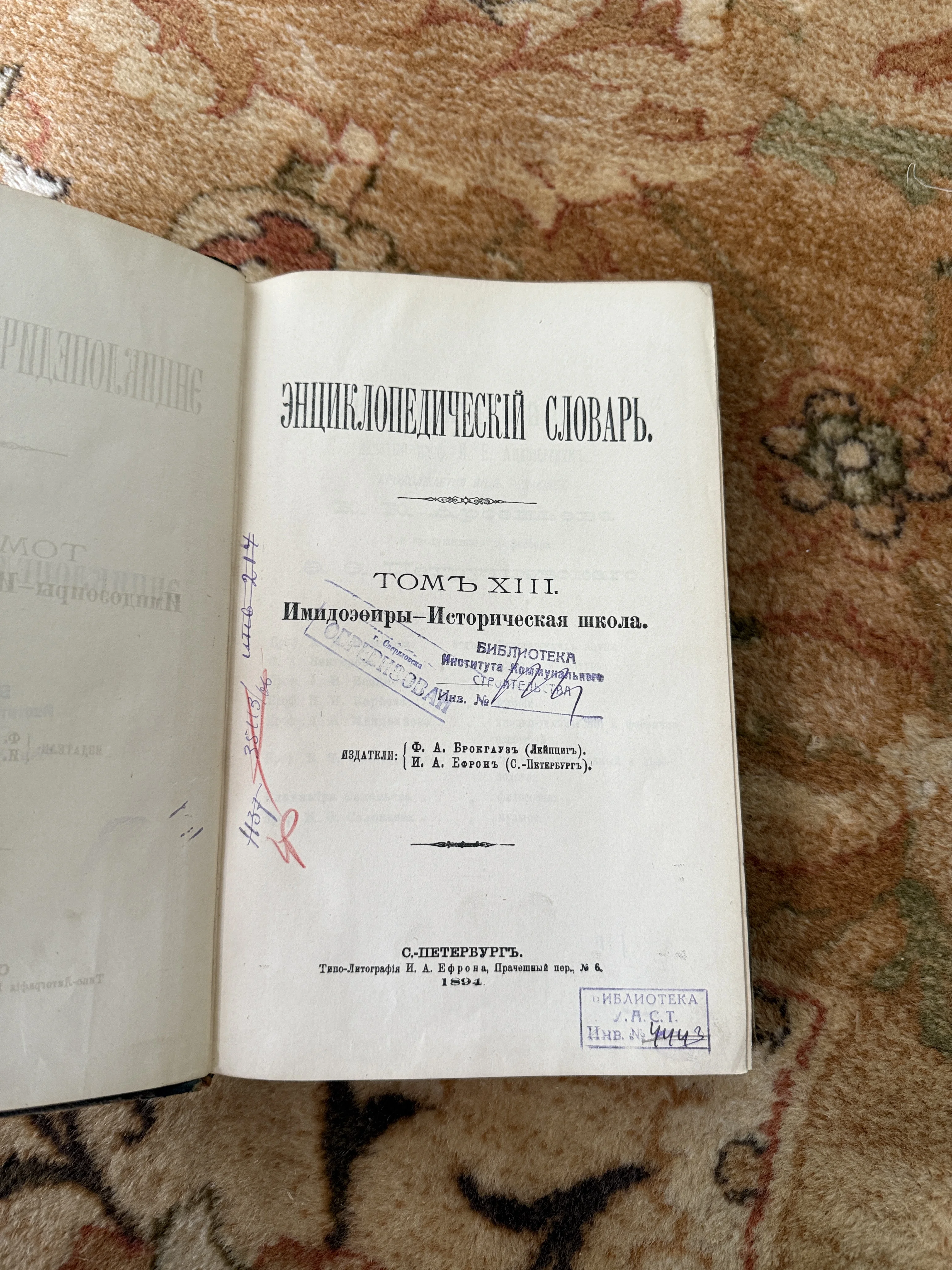 Титульный лист тринадцатого тома Энциклопедического словаря Брокгауза и Ефрона с библиотечными печатями и штампами, изданный в 1894 году.