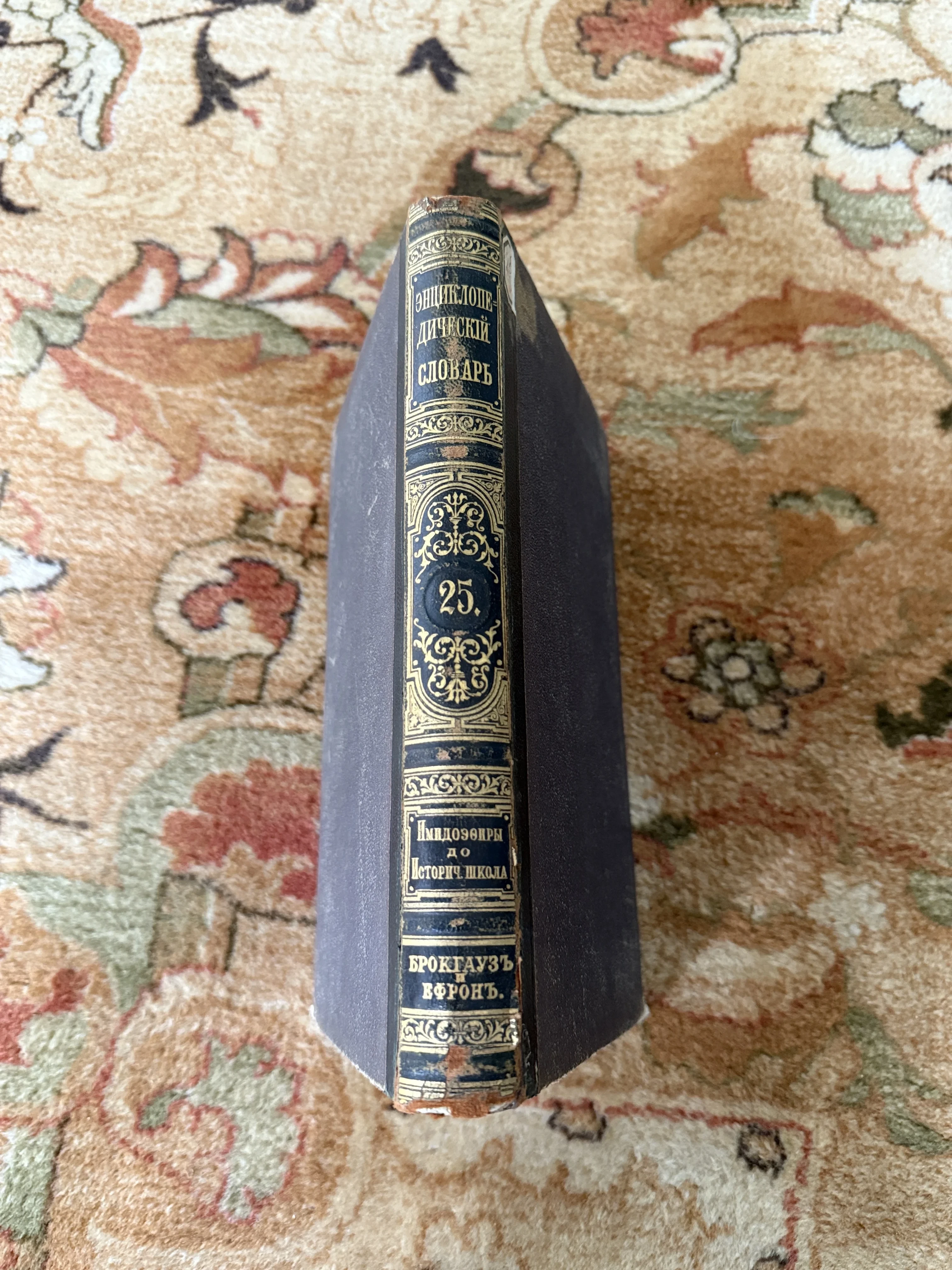 Корешок антикварного 25-го тома Энциклопедического словаря Брокгауза и Ефрона с золотым тиснением на фоне ковра.