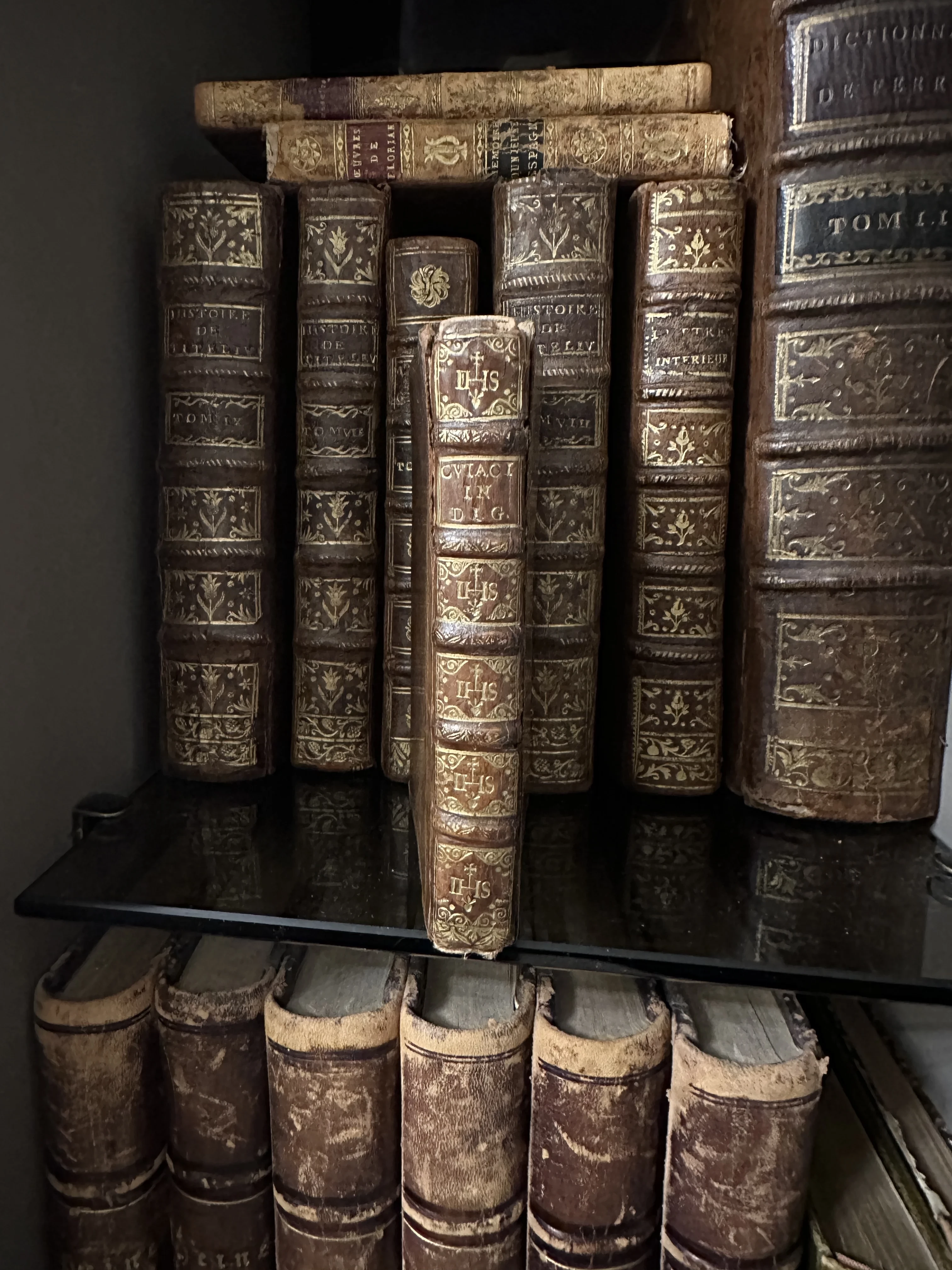 Изысканная подборка старинных фолиантов, украшенных сложным золотым тиснением и символикой IHS. Благородная патина на потертой коже и пожелтевшие страницы создают неповторимую атмосферу классической частной библиотеки прошлых столетий.
