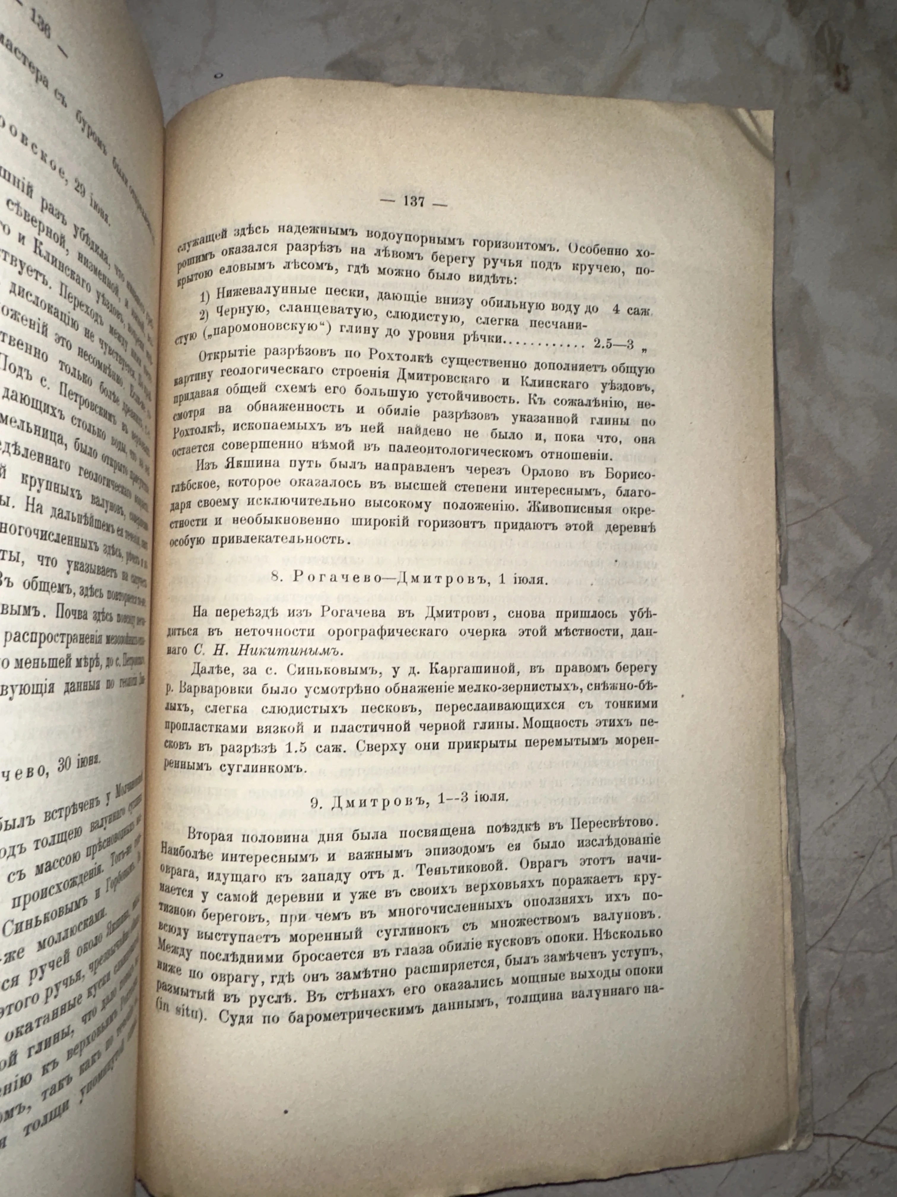Аутентичный разворот антикварного издания, посвященного детальному географическому и геологическому описанию Дмитровского и Клинского уездов. Пожелтевшая от времени бумага и дореволюционная орфография подчеркивают историческую ценность этого научного труда. Идеальный экземпляр для коллекционеров краеведческой литературы и любителей подмосковной истории.