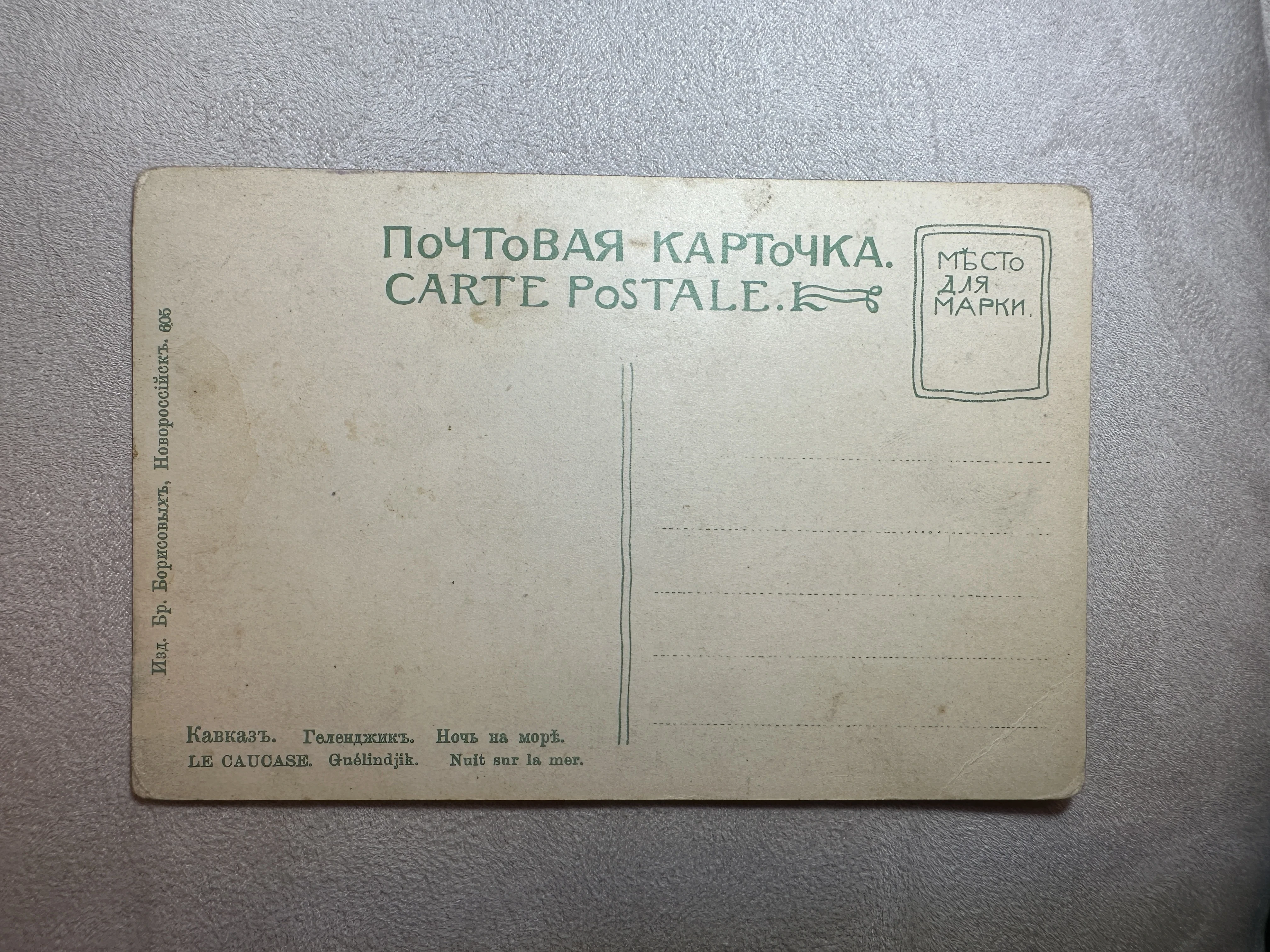 Чистая оборотная сторона редкой открытки, выпущенной издательством братьев Борисовых в Новороссийске. Плотная пожелтевшая бумага с характерной патиной времени и двуязычные надписи на русском и французском языках подчеркивают подлинность и историческую ценность этого экземпляра.