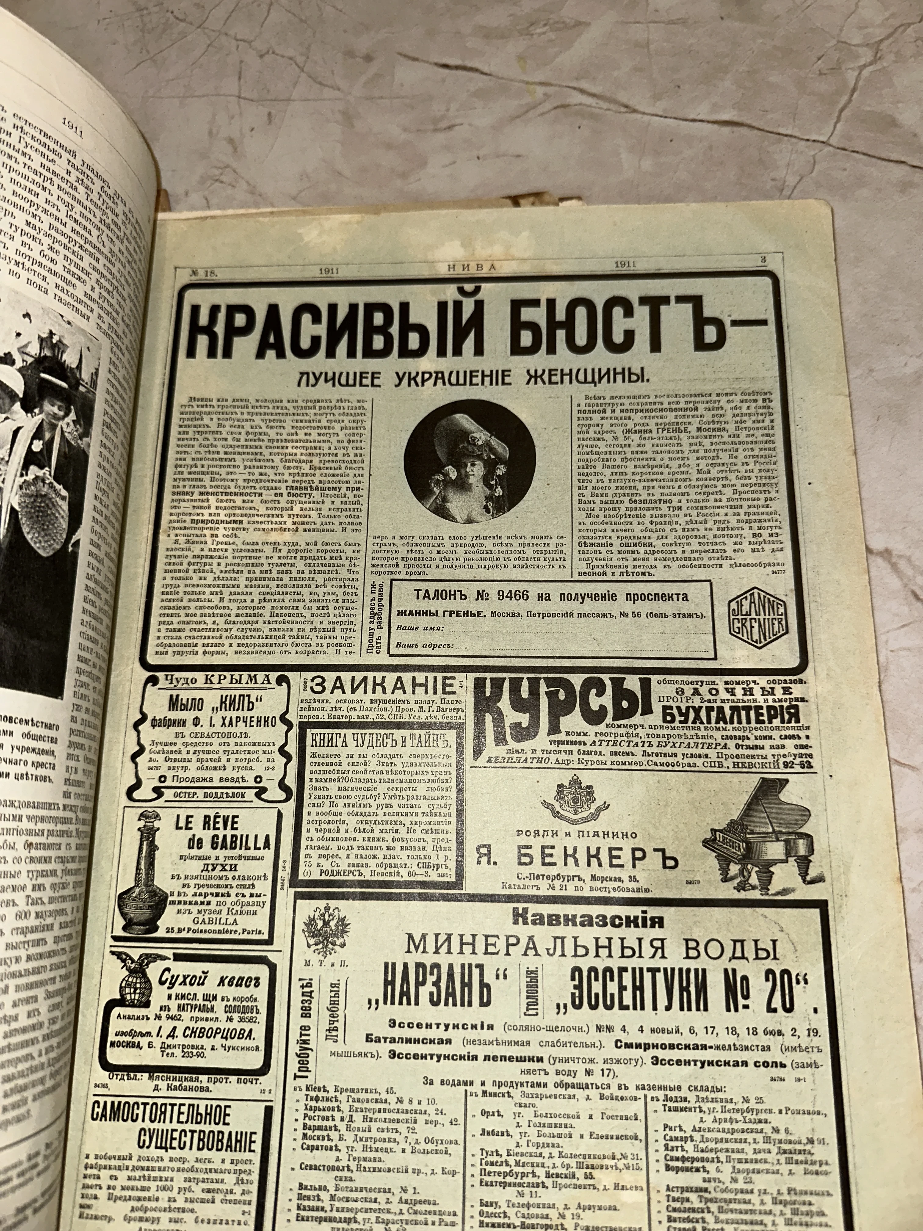 Живое свидетельство эпохи: страница популярнейшего иллюстрированного журнала «Нива» с подборкой характерной коммерческой графики 1911 года. На пожелтевшей бумаге соседствуют курьезные объявления о красоте, реклама знаменитых роялей Беккера и кавказских целебных вод, передавая неповторимый колорит повседневной жизни Российской империи. Лист сохранил дух времени и станет великолепным экземпляром для коллекции старинной периодики.
