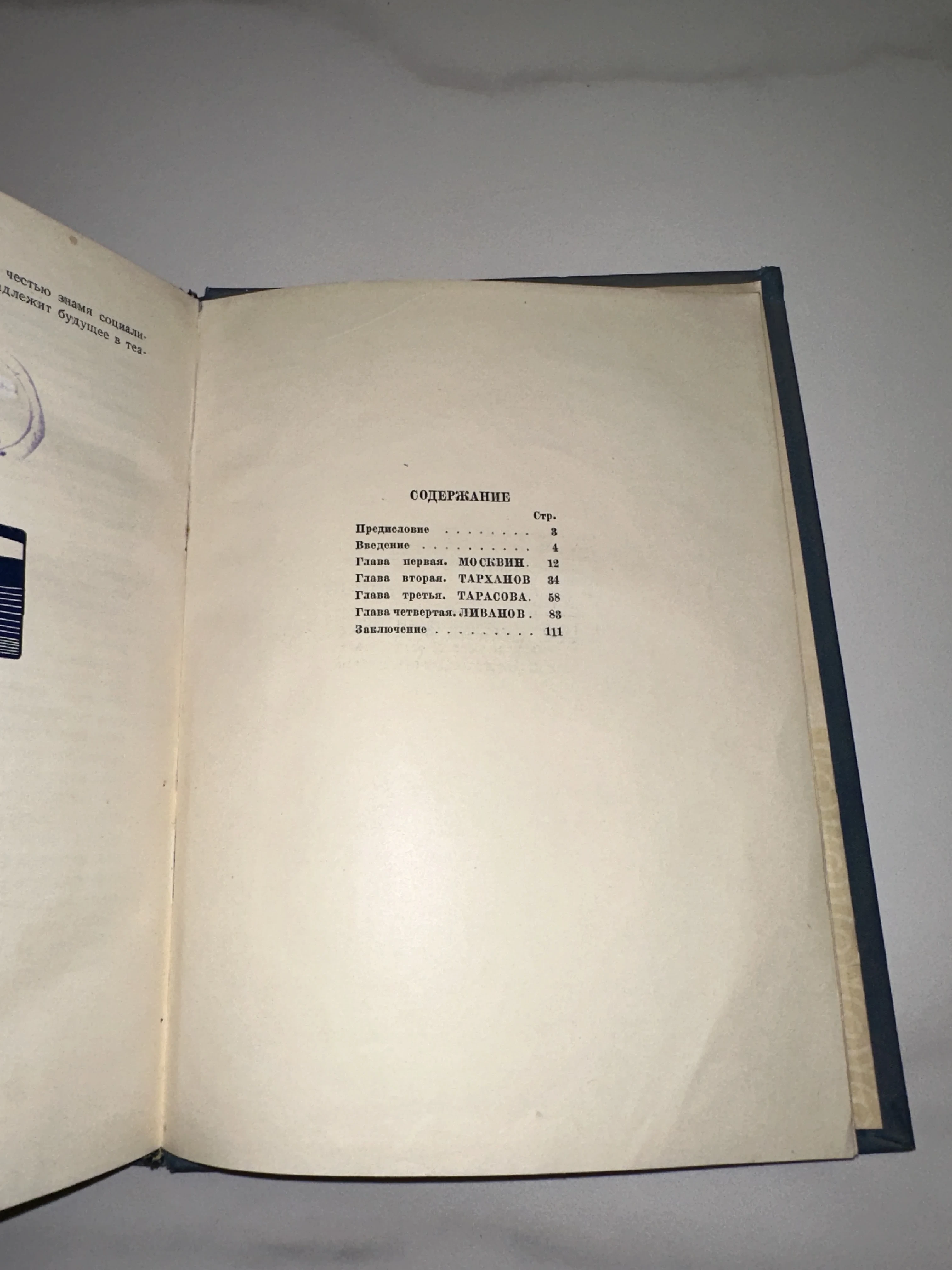 Разворот старой книги на странице содержания с именами советских актеров: Москвина, Тарханова, Тарасовой и Ливанова.