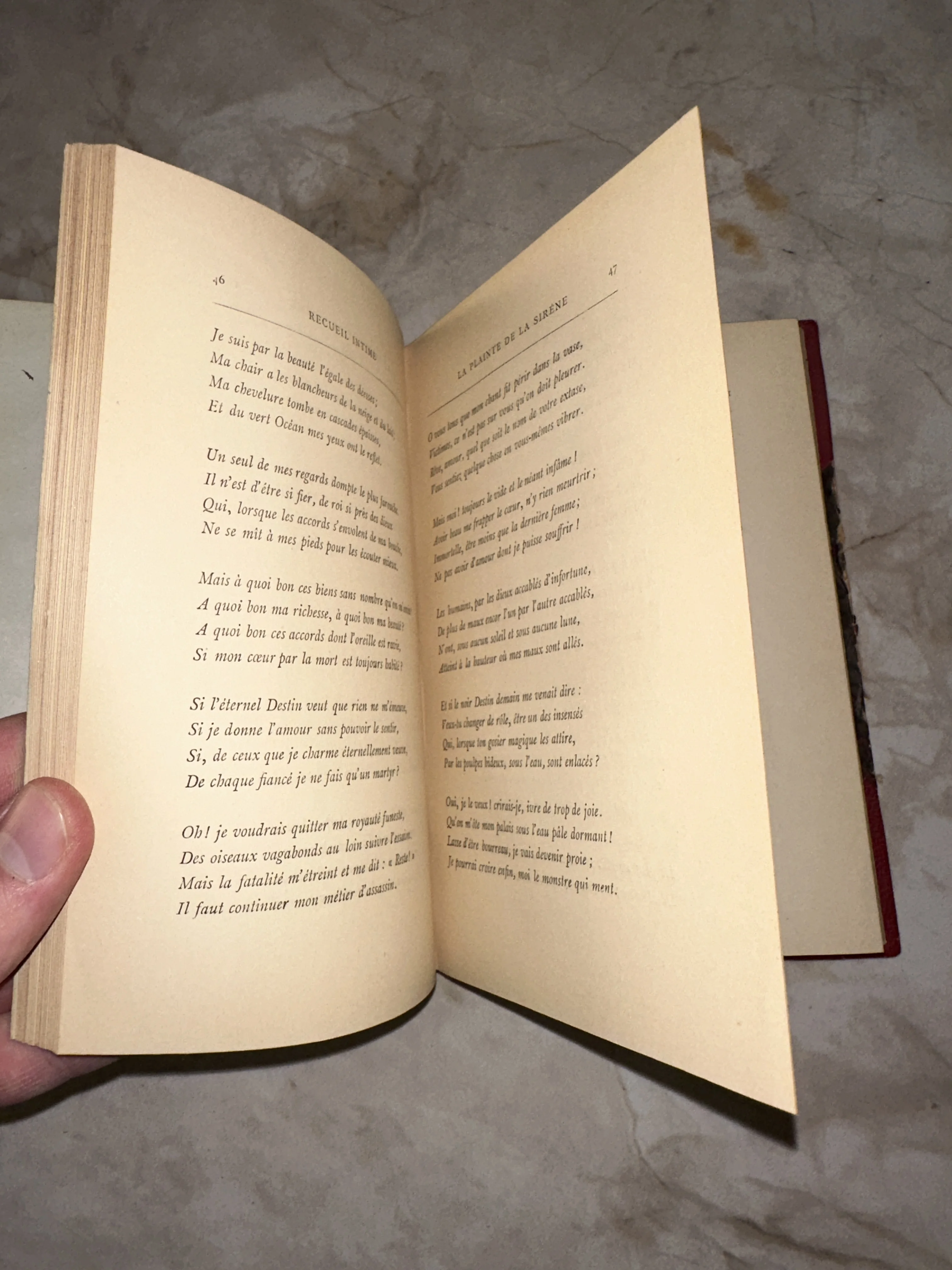 Элегантный разворот антикварного издания со стихотворением «Жалоба сирены», напечатанным на благородно пожелтевшей бумаге с характерной фактурой. Тонкая типографика и классическая верстка передают изысканную атмосферу европейских литературных салонов прошлого столетия. Коллекционный экземпляр в хорошей сохранности, представляющий интерес для ценителей редкой букинистики.