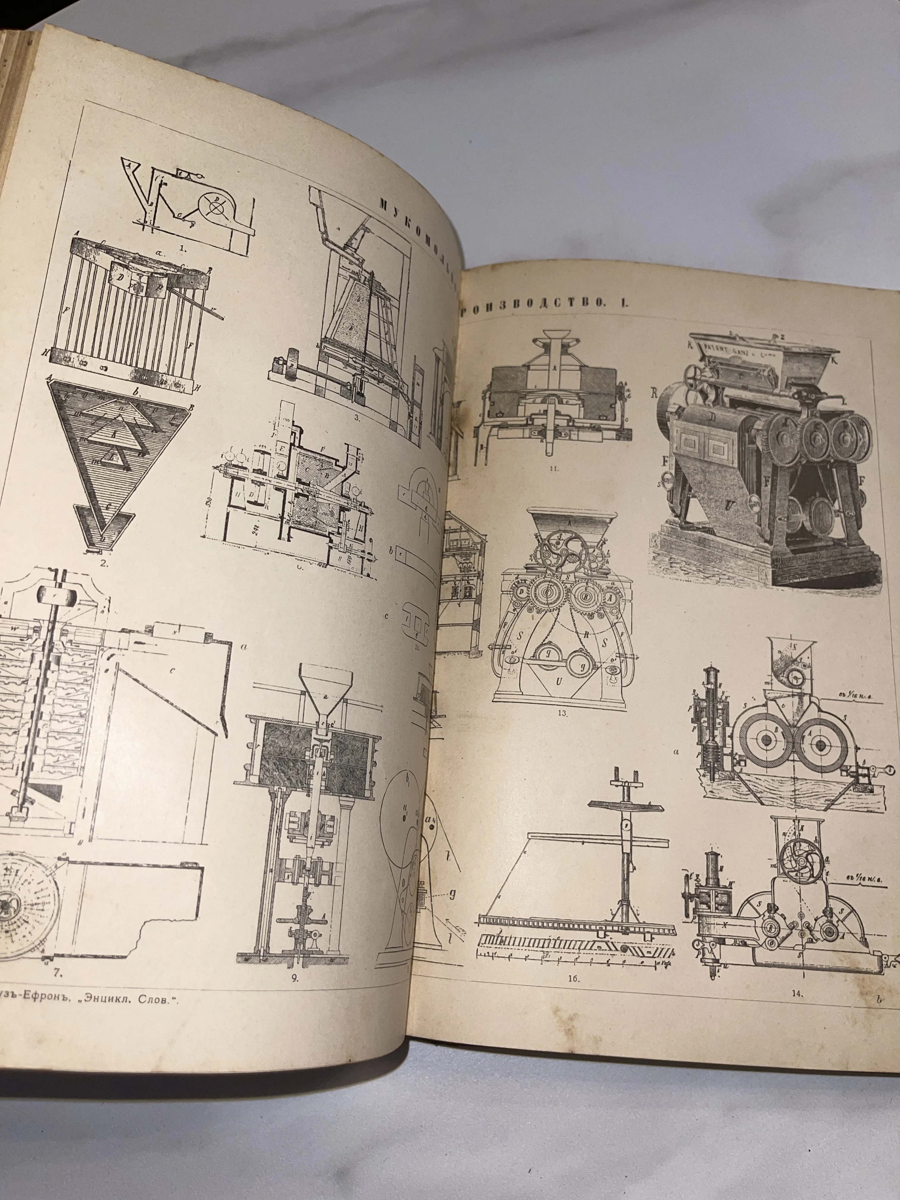 Уникальный разворот из легендарной энциклопедии Брокгауза и Ефрона, демонстрирующий торжество инженерной мысли конца XIX века. Тщательно прорисованные схемы и гравюры станков сохранили идеальную четкость, а естественное пожелтение бумаги придает изданию особый антикварный шарм и историческую ценность.