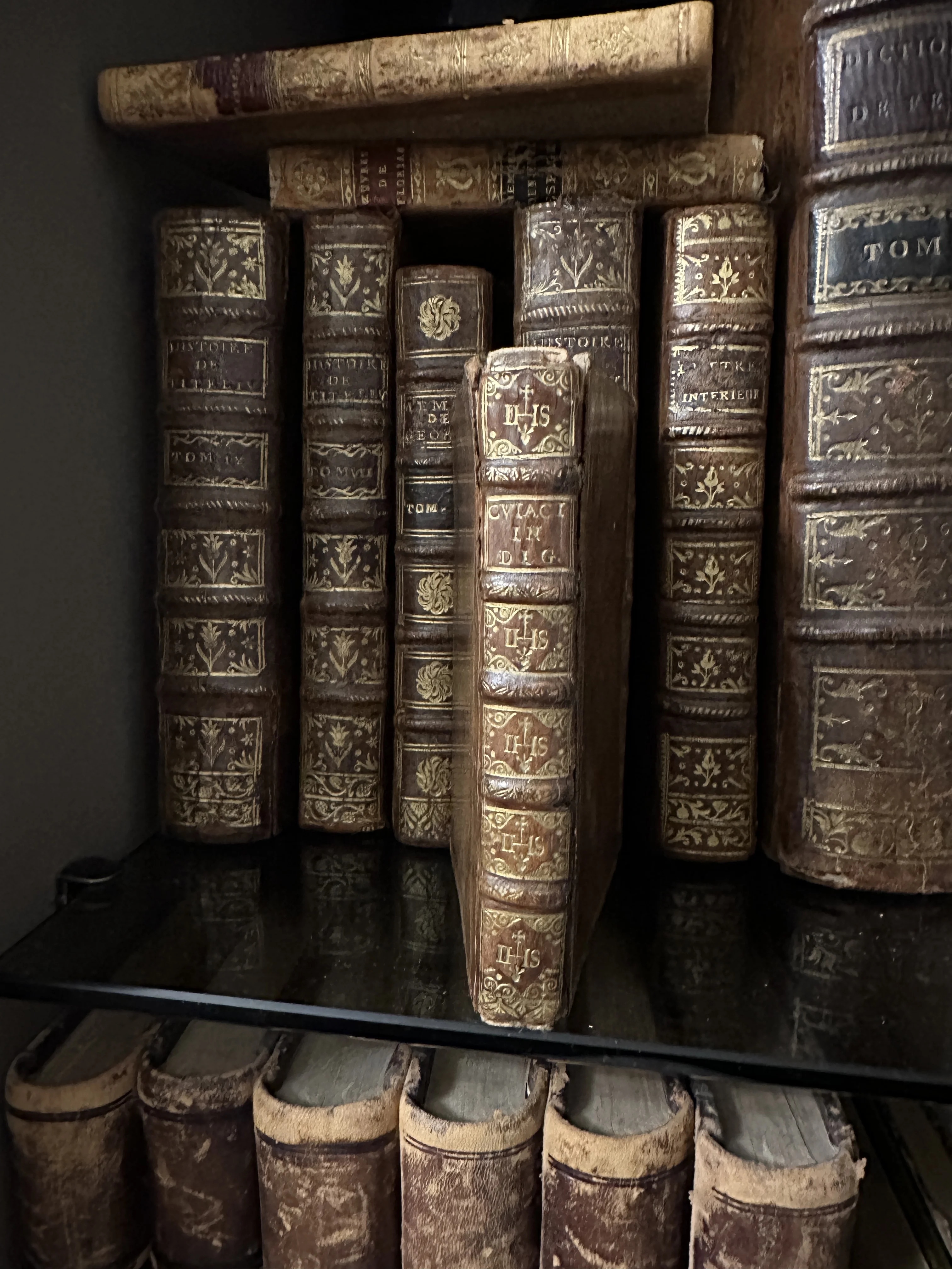 Великолепное собрание старинных фолиантов, облаченных в благородную кожу с богатым золотым тиснением и характерными бинтами на корешках. На книгах видна патина времени и сакральная символика, что превращает это собрание в истинное сокровище для ценителя истории и редких изданий.