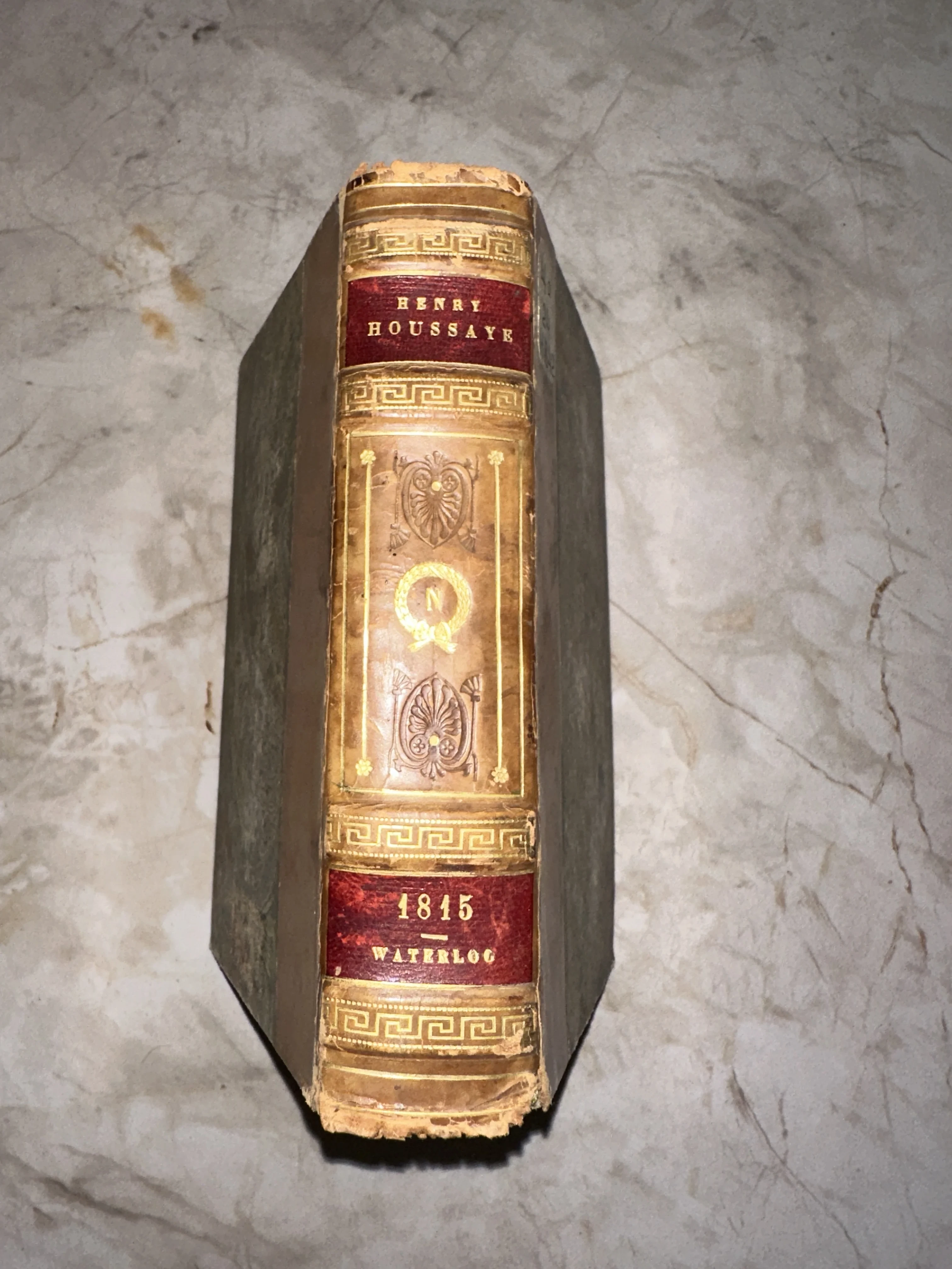 Монументальный труд французского историка Анри Уссе представлен в великолепном полукожаном переплете с изящным золотым тиснением и имперской символикой. Время оставило на книге благородные следы бытования, превратив её в подлинный артефакт для коллекционеров военной истории и ценителей классического книжного переплета.